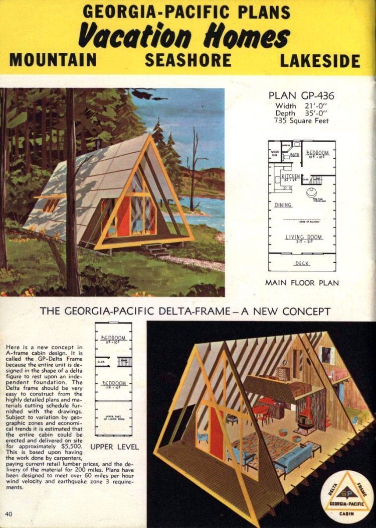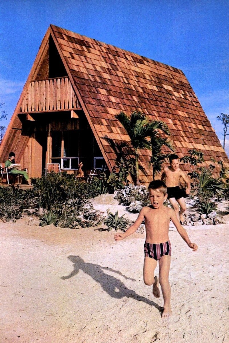 사실 이 A 프레임 집은 옛날에 미국에서 60~70년대에 엄청 인기였다고 한다. 한적한 호숫가나 산속에 지어놓는 여름용 별장이나, 집의 풀장 옆에 만들어놓는 풀 사이드 하우스 같은 걸로, DIY로 직접 만드는 킷트가 전국적으로 곳곳에서 팔렸단다. 찾아보니 정말 쇼킹한 가격이 적힌 옛 카달로그 사진들이 많았다. 주택에 살면서 가라지에 이런저런 왠만한 공구를 다 갖고있는 집이라면, 이런 자그마한 A 프레임 하우스 킷트를 사다가 주말에 뚝딱 뚝딱 만들거나, 적당한 가격의 사이즈로 주문하면 업체가 뾰로롱 하고 지어주는 것이다.