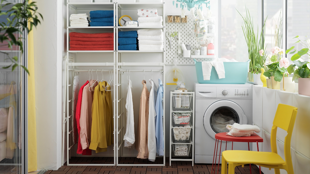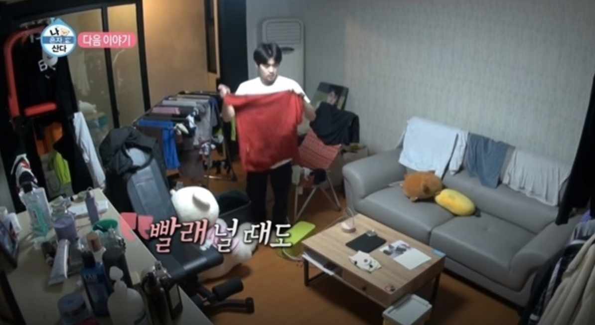 "수건 같은 거 뒤에 안 보이게 쇽~ 하고 널면 돼요."
