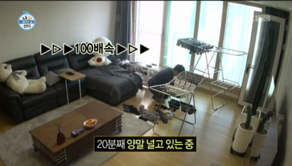 한국은 어떨까. 한국은 대부분 빨래를 거실에 널어놓는다. 주로 다른 나라에서 사는 내가 한국의 모습을 접하는 건 대부분 방송 속인데, 티브이에 나오는 집이라고 나름 신경을 썼을 텐데 다를 게 없었다. 인테리어 신경 쓴 멋진 집이에요!라는 컨샙의 방송이 아닌 이상, 자연스러운 거실 풍경에는 연예인 집이든 일반 가정집이든 다들 한편에 빨래 건조대가 있다. 더 심하면 그 옆에 러닝머신이나 자전거 머신에도 빨래가 흐느적 덮여있었다. 한동안은 다들 베란다에 빨래를 널었는데, 베란다 확장 붐이 일면서 많은 베란다가 사라졌다. 근데 인간은 계속해서 옷을 입고 빨래를 해야 한다. 넓은 거실을 얻게 된 대신 흉물스러운 'ㅈ'자 모양의 빨래 건조대를 항상 쳐다보며 살게 되었다. 설상 멋진 뷰가 보이는 아파트라 해도, 그 뷰 앞에는 항상 어떻게 널어도 너저분할 수밖에 없는 운명의 빨래건조대가 있는 것이다.