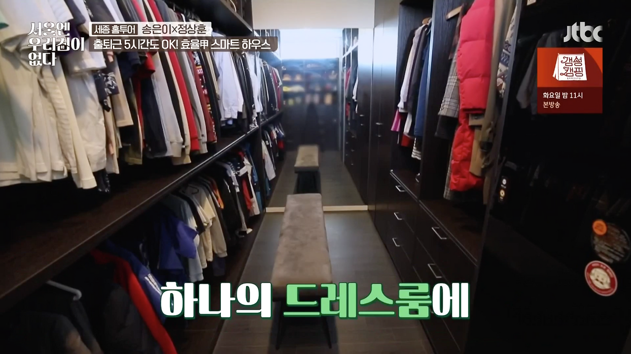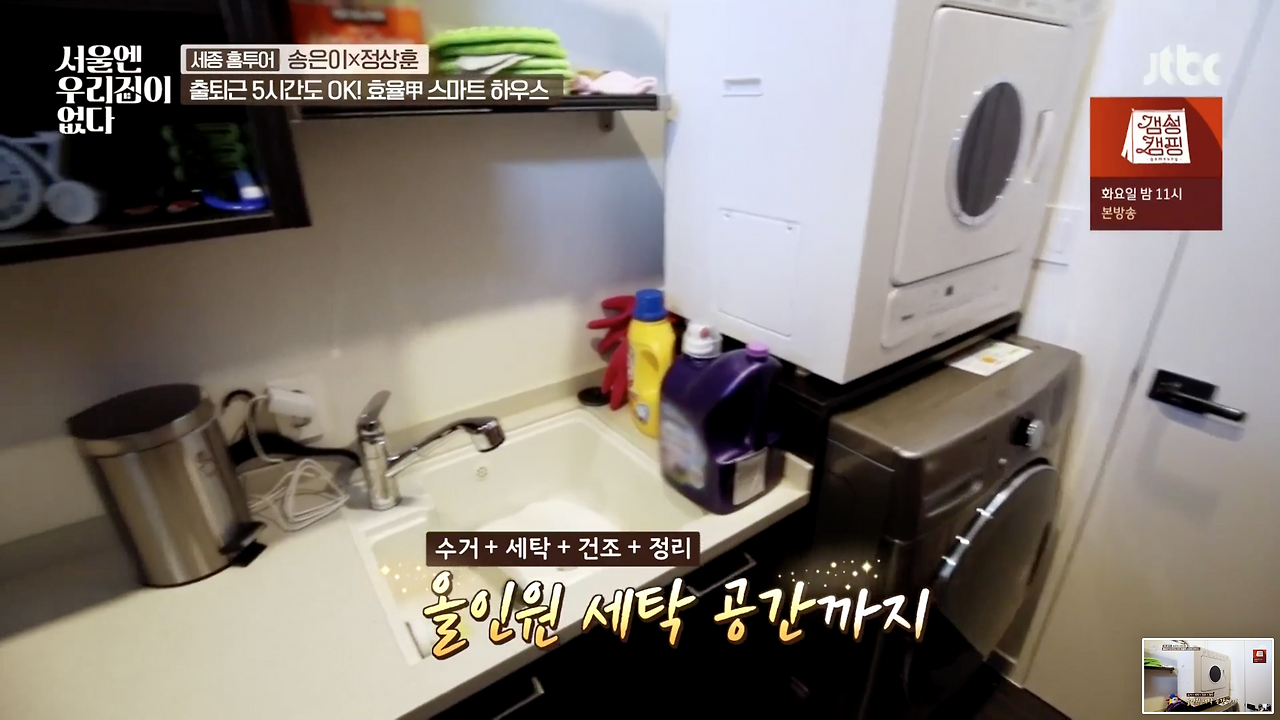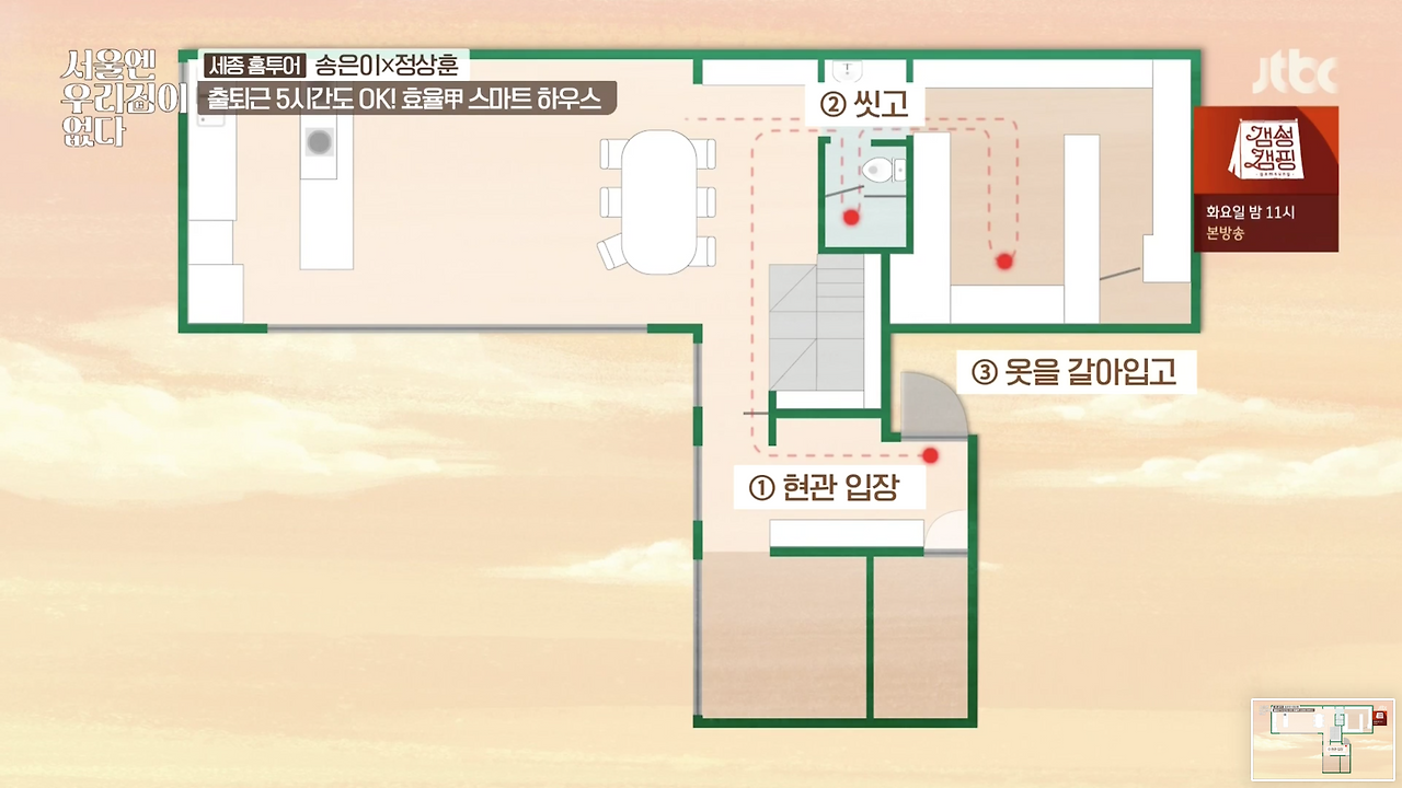 물론 당연히 요즘엔 안 그런다고 본...보고 싶다. 그 예를 들자면 최근 새로 나온 집 관련 예능 방송 <서울엔 우리집이 없다> 1회에 이미 내가 생각한 구조를 대략 비슷하게 설계한 케이스가 나왔다. 세종시에 사는 부부와 아이 셋, 충 5명이 사는 집이었는데, 1층에 가족 다섯 명의 옷을 싹 다 걸어서 옷가게만큼 큰 옷방을 만들고, 안쪽에 세탁실과 손빨래 싱크대, 카운터탑까지 한 동선으로 연결된다. 욕실 -> 옷방 -> 세탁실 요런 동선이었다. 조금 다르지만 기본적으로 이 세 가지가 모여있는 게 편리하다는 생각은 같다. 사람들 생각하는 거, 다 비슷하구나~ 했다. 좋은 일이다. 이렇게 동선이 편한 쪽으로 많은 이들이 생각하면 그만큼 더 편한 구조의 집들이 늘어날 테니 말이다.