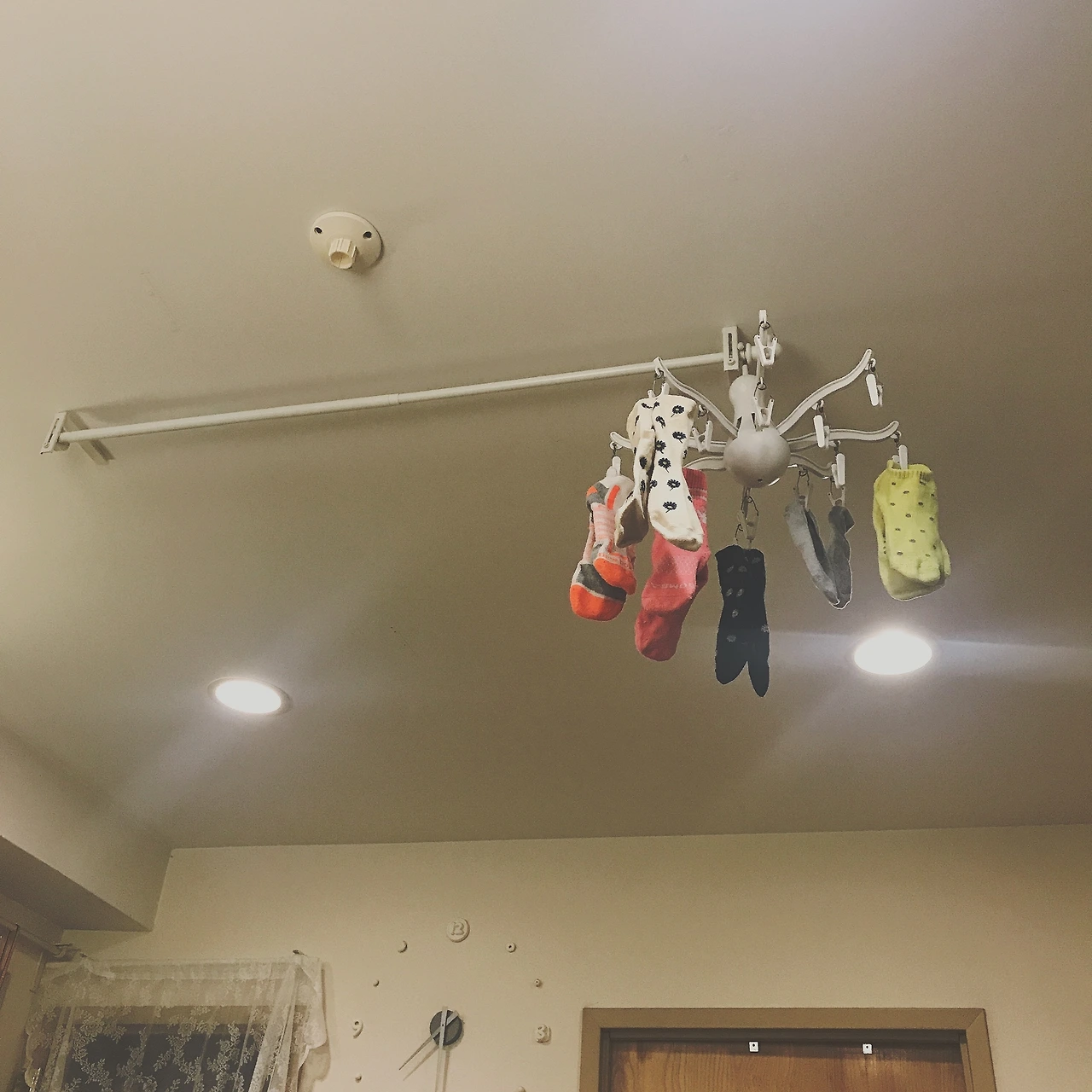 해서 지금 우리는 수건과 침대 시트, 집에서 입고 뒹구는 잠옷만 건조기에 팍팍 돌리고 나머지 70%는 널어서 자연건조를 하게 되었다. 그런데 이 집은 마당도 베란다도 뭣도 없는 아파트. 게다가 룸메이트들과 살고 있어서 거실 공간에 빨래를 널을 수는 없었다. 안방에서 어떻게든 해결해야 했다. 그러다가 눈에 띈 게 있었다. 한국의 일반적인 아파트보다 조금 층고가 높은 천장에는 내가 예전에 공주님처럼 침대 3면을 레이스 커튼으로 감싸겠다고 난리 칠 때 설치해놓은 커튼봉이 남아있었다. 구조가 바뀌어서 공주님 침대는 사라졌지만 커튼레일만 덩그러니 천장에 붙어있다. 의자를 놓고 올라가 빨래를 옷걸이에 걸어서 그 커튼레일에 착착 걸었더니, 아래로는 왔다 갔다 할 수 있어서 바닥 공간을 차지하지도 않는 나름 훌륭한 시스템이 되었다. 일반적으로 쓰이는 'ㅈ'모양의 빨래 걸이대는 너무 흉물스러워서 죽어도 사기 싫었기 때문에 천만다행이었다. 사실 이렇게 해놓으면 빨래를 널어놓은 게 아니라 높이 설치해놓은 오픈형 옷장으로 보인다. 과거에 레이스 커튼으로 감싸인 침대를 하겠다고 전동 드릴을 들고 천장에 구멍을 뚫고 셜쳐댄 나에게 잘했다고 칭찬했다. 빨래가 다 마르면, 이미 옷걸이에 걸려있기 때문에 그대로 빼내서 원래 옷장 속 레일에 걸면 된다! 그리고 때로는 귀찮아서 양말 같은 건 그냥 내버려뒀다가, 필요할때 뽑아서 신는다.