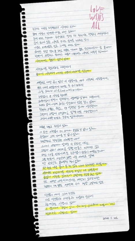 저는 탑100귀를(차트 탑 100에 갈 노래를 귀신같이 알아본다는 뜻) 가졌습니다.. 최근 나는 남들과 다르고 최고고 쌔비지 배디 비치 퀸카다 다 비켜라 라는 내용의 노래들을 노동요로 들어왔는데요. 그들은 저에게 자신감을 주는 훌륭한 노동요였지만 ‘love wins all’이 나온 후로 다른 노래를 듣지 못하고 있네요. 멜론 차트를 장악한 것을 보면 다른 이들도 저와 비슷한 감정을 느끼고 있지 않을까 생각하며, 노래의 가사가 현재 한국사회에서 얼마나 시의성 있는 주제인지 말할 수 있을 것 같습니다.