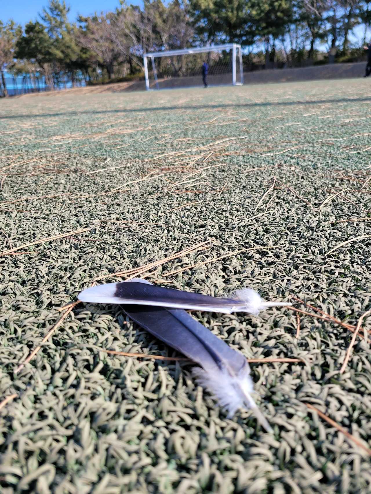 내가 생계를 위해 일하는 일터는 바닷가에 위치해 있어서 사내 운동장에는 갈매기 깃털이 드물지 않게 떨어져 있다. 오전 근무 후 축구장 주변을 식후 산책하다가 깃털을 발견했고, 날개 가진 것의 비상을 위한 퍼덕거림이 시가 되는 찰나를 나는 사진 찍었다.