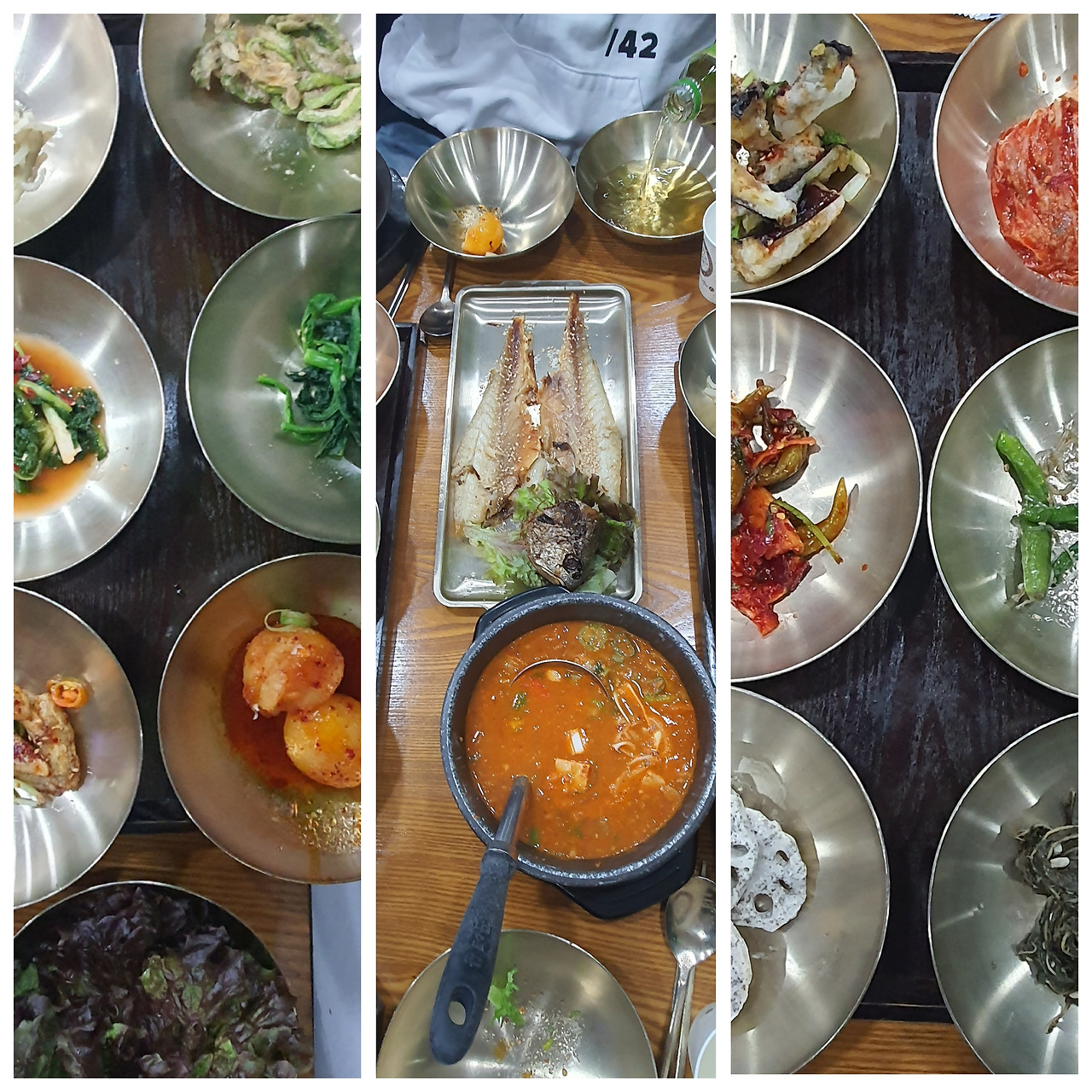 식당 좌석에 앉자마자 나무쟁반에 올려진 밑반찬 그릇들이 테이블 위에 먼저 세팅되었다.