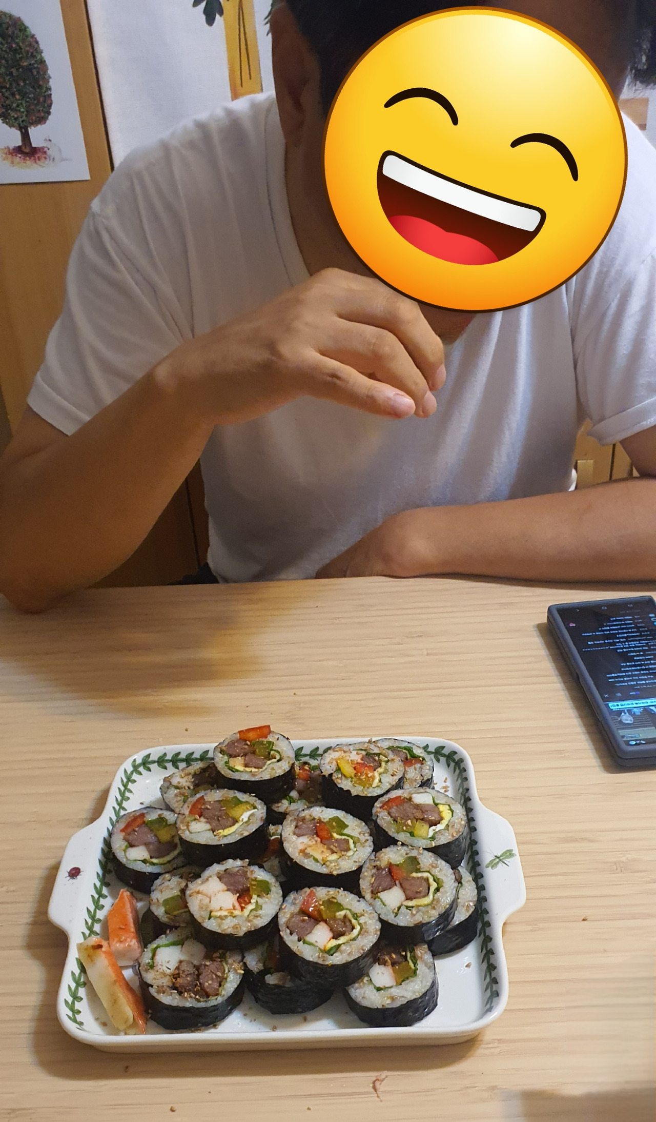 낮에 김밥도시락을 만들고 남은 김으로 저녁에 두 번째 김밥 시스템이 가동되었다.