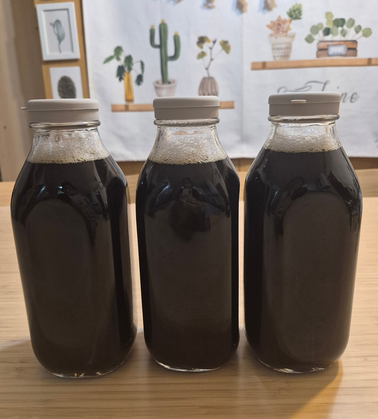처음에 진하게 달인액과 재탕한 액을 반씩 섞어주면 각 1리터씩 3~4병의 홍삼달임 물이 완성된다.