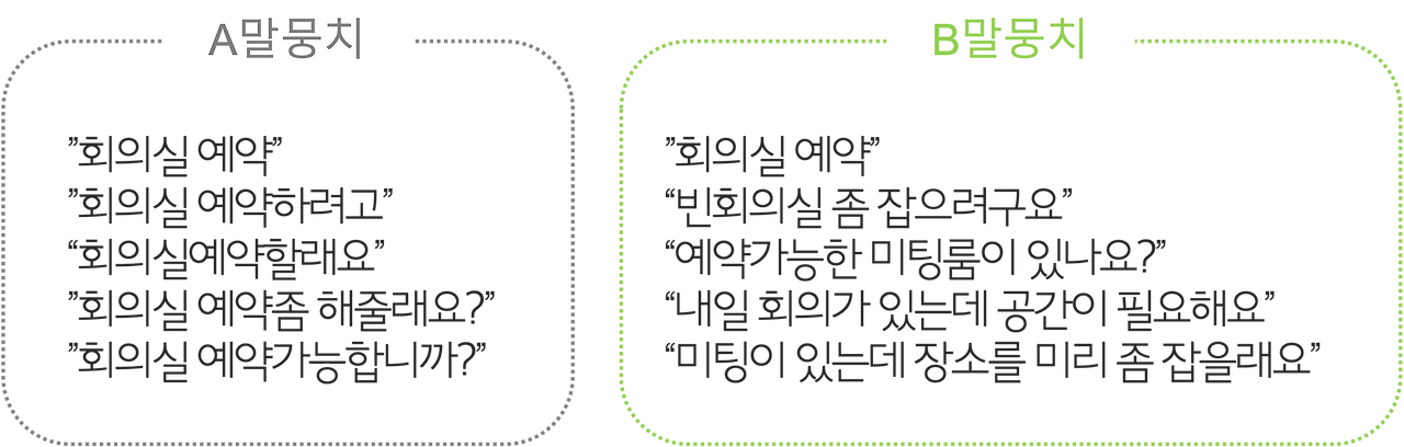 AI에게 학습을 할때는 A말뭉치보다 B말뭉치로 학습을 시켰을때 사용자의 발화가 다양해도 어떤 의도에 해당하는지 분류를 더 잘할 수 있습니다. 자칫 A말뭉치로만 학습이 된 AI봇의 경우, '미팅룸을 잡을래요'라는 말이 '회의실예약'과 같은 의도인지 분류를 하기 어렵습니다.