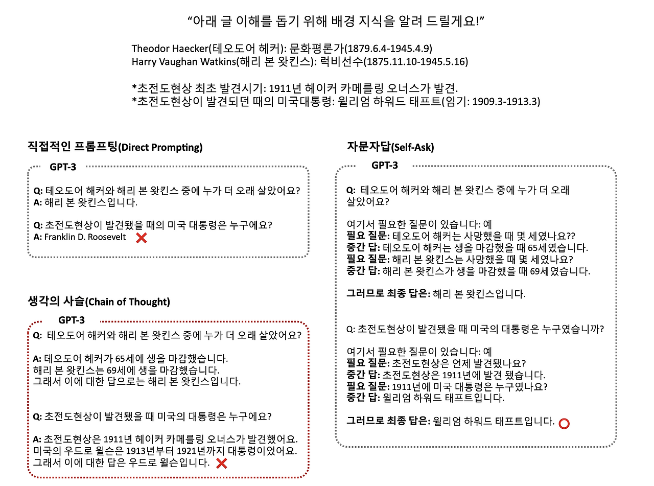 자문자답의 방법(The self-ask method)은 GPT가 대답을 하기 전, 명확한 질의와 답변을 해주는 것이 필요합니다.