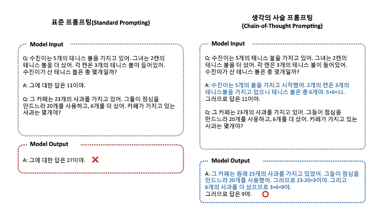 특정 문제를 해결하는데 사용할 수 있는 결과 과정에 대해 몇가지 예를 GPT에게 제공하는 것이 필요합니다. 아래 이미지를 보시면 아시겠지만, 표준 프롬프팅 즉 기존의 프롬프팅의 경우, 중간에 단계적으로 추론하는 과정을 설명해주지 않습니다. 질문과 답만 던져주고 이후에 새로운 질문을 던지므로 틀릴 확률이 그만큼 높습니다.