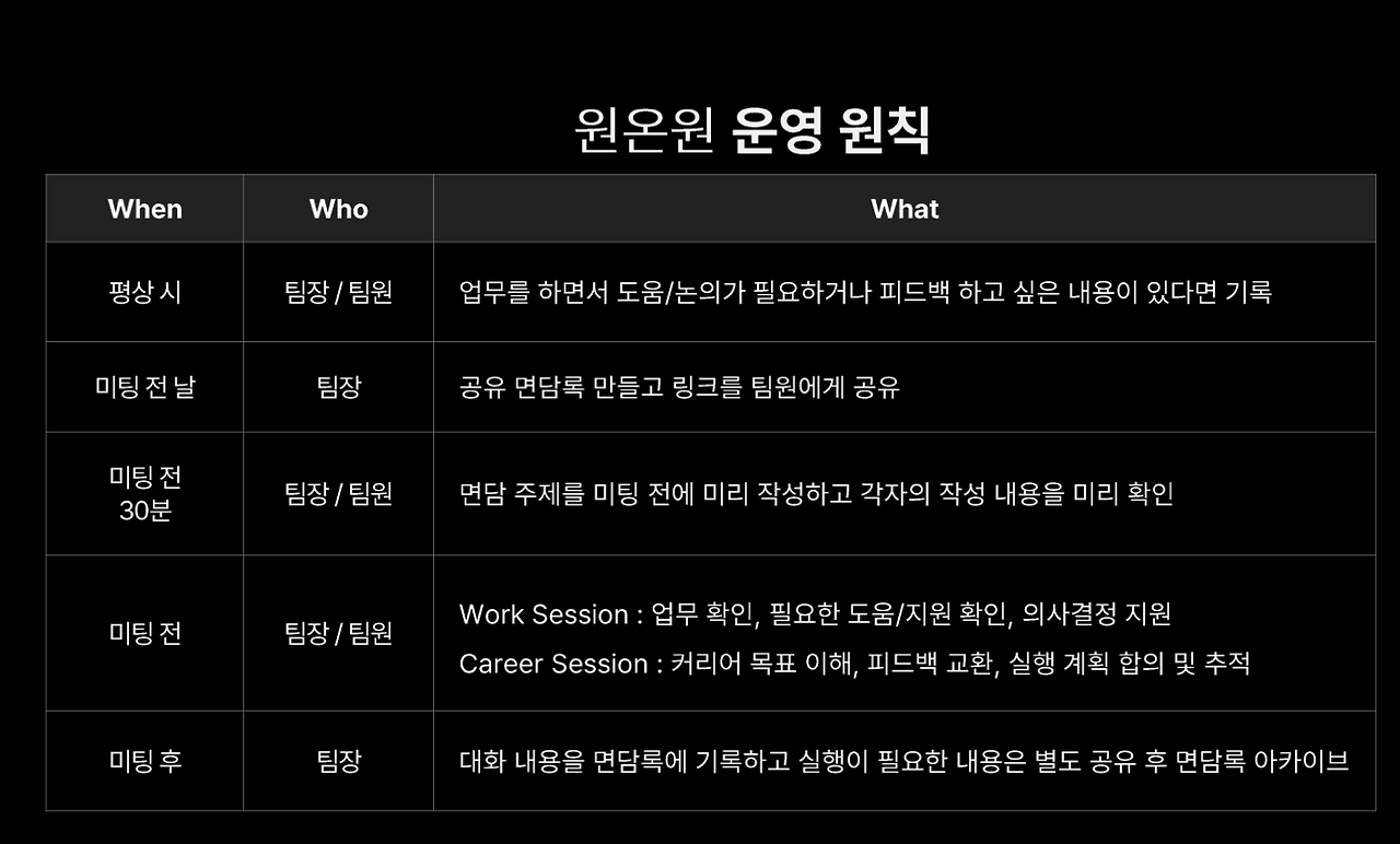 (팀원들과의 1:1미팅을 할 때, 사수와 후임의 관계에서 진솔하고 솔직한 마음을 이끌어내기가 쉽지 않더라구요ㅠ)