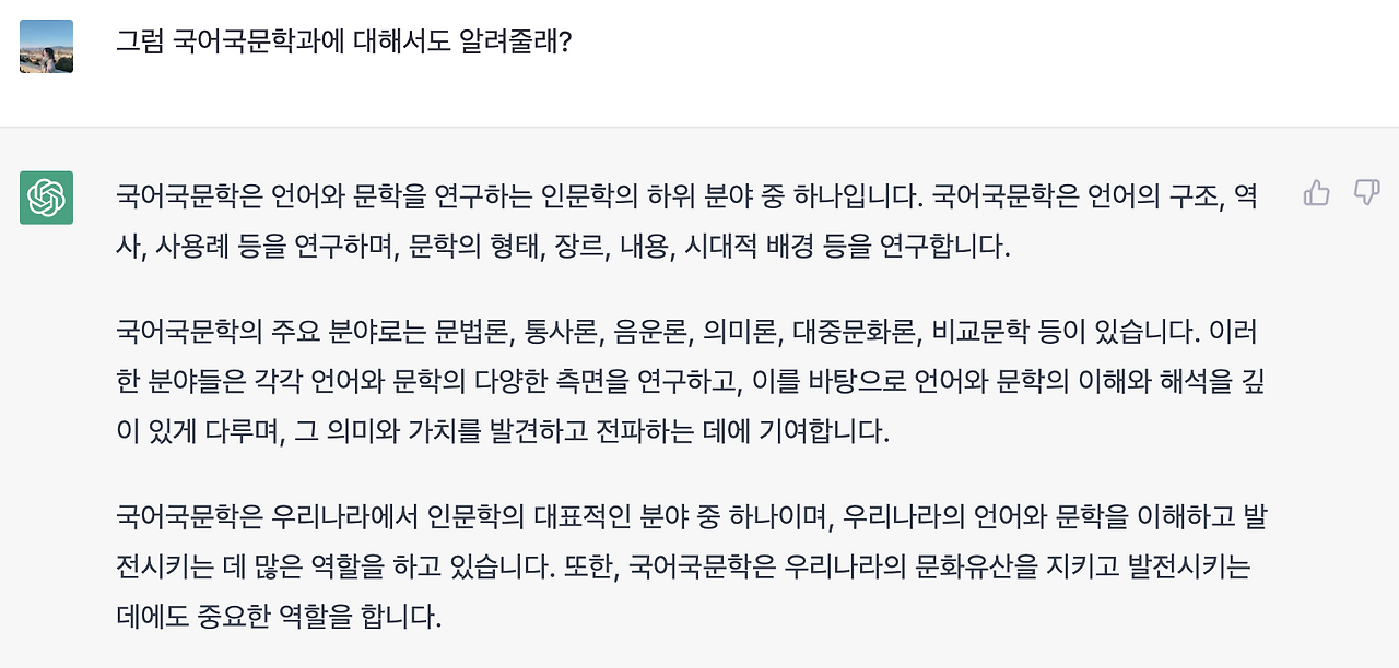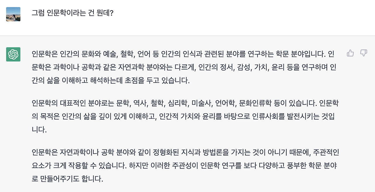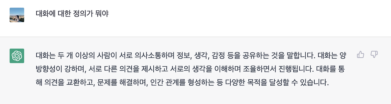 우선, 글을 쓰기 전에 '대화디자이너', 대화와 인문학이 무엇인지 chatGPT에게 물어보는 것으로 시작했어요:)