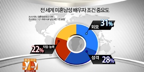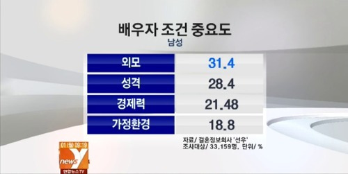 전 세계적인 관점에서도 미혼남성의 배우자 조건은 단연 "외모"가 1위를 차지하고 있고 우리나라의 경우도 두말할 필요가 없다. 즉, 여성을 선택하는 기준이 "외모"인 것이고 필자 또한 어느정도 동의하는 부분이다.
