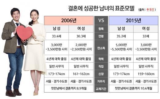 남성의 경우 2006년도 33.4세에서 2015년도에 35.2세로 1.8년 늦어졌으며 여자도 마찬가지로 30.3세에서 32세로 1.7년 늦어졌다.