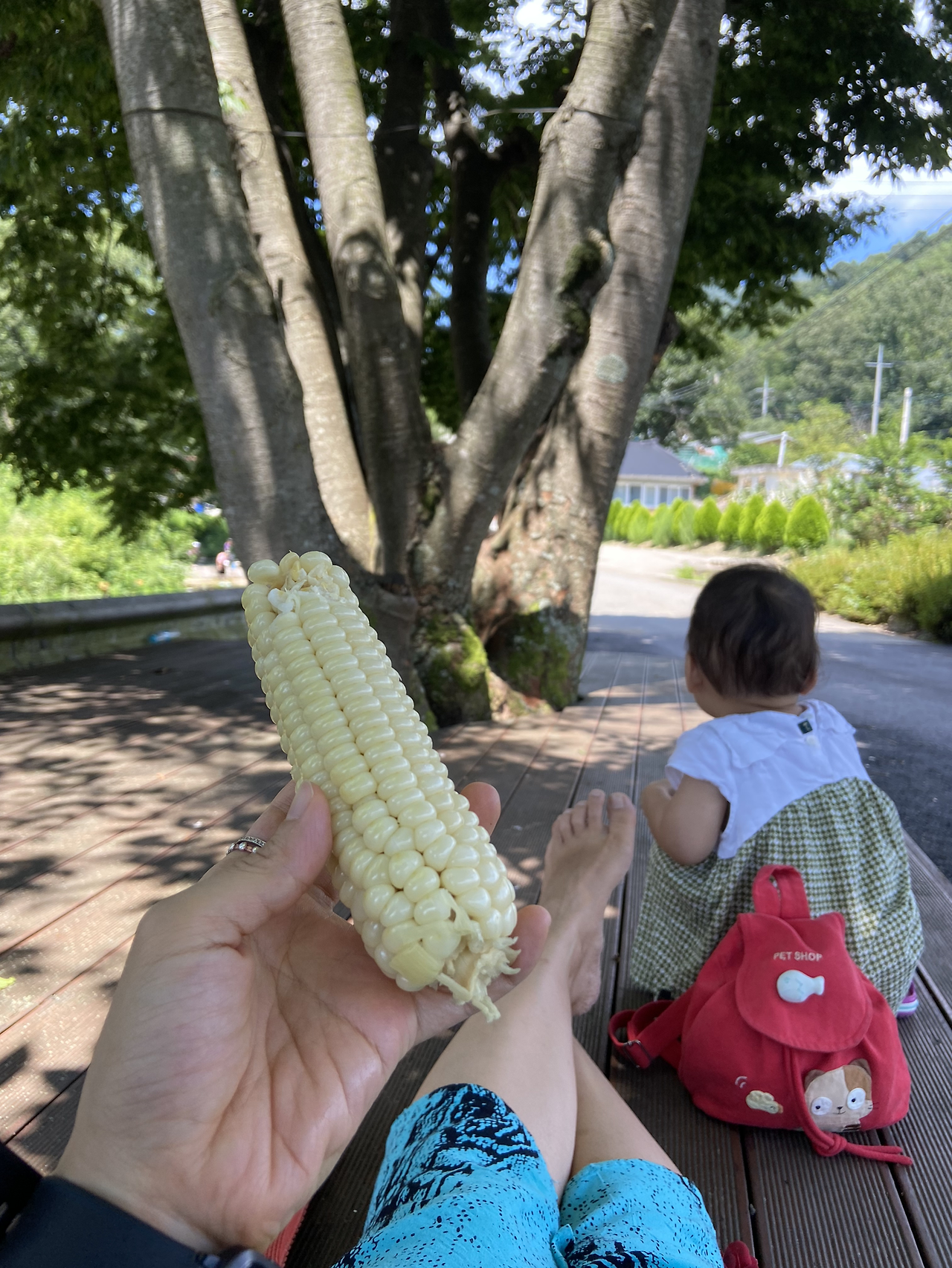 아침 일찍 옥수수를 찌고 간식을 챙겨 배낭을 메고 별이 손을 잡고 목적지 없는 여행길을 나섰다. 버스를 타고 가다가 놀기 좋은 냇가가 있으면 내려서 놀다가 둥구 나무 아래에서 간식을 먹고 책도 읽고 동네 할머니랑 이런 저런 이야기를 나누다가 또 천원 택시를 타고 다른 마을에 가서 또 물놀이를 하고 놀다가 또 다른 마을에 가서 도서관에 들어가 시원한 에어컨 바람에 더위를 잠시 식히기도 하고 이 마을 저마을 구경하다가 진안 끝 주천면 까지 오게 되었다. 다행이도 주천에 살고 있는 아는 언니 덕에 목적지가 정해져 게릴라 여행은 종료 되었고 별이는 냉면집에서 돈방석을 이불 삼아 한참동안 잠을 잤고 나는 여유있게 시원한 맥주 한잔과 냉면을 먹었다.