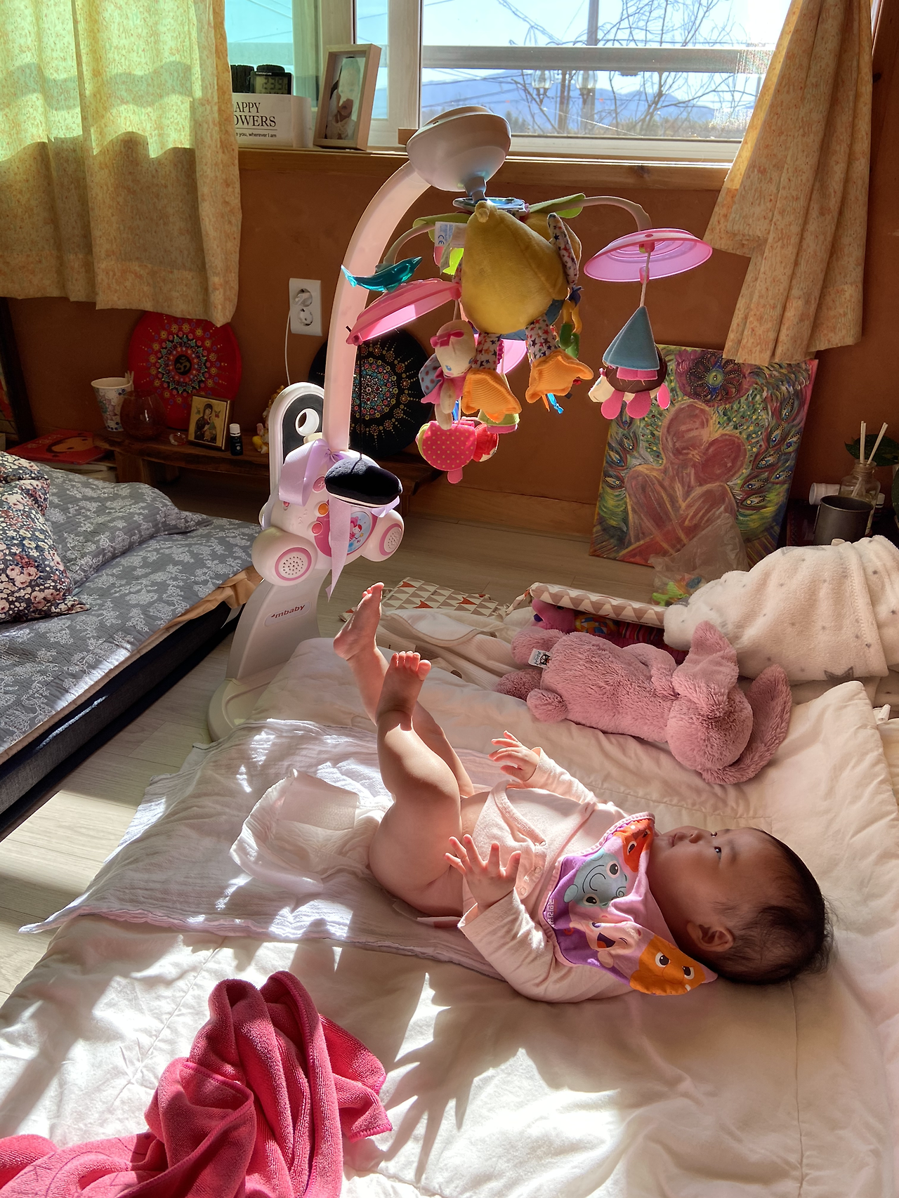 오늘은 한별이가 아침 잠을 자는 사이 후다닥 집안 일을 끝냈다. 아침 볕이 좋고 따뜻해서 창문을 열고 답답한 기저귀를 벗겨서 햇빛 샤워와 바람 샤워를 하는 동안 나는 한별이 옆에 앉아 행복해 보이는 아이의 모습을 한참동안 바라봤다.