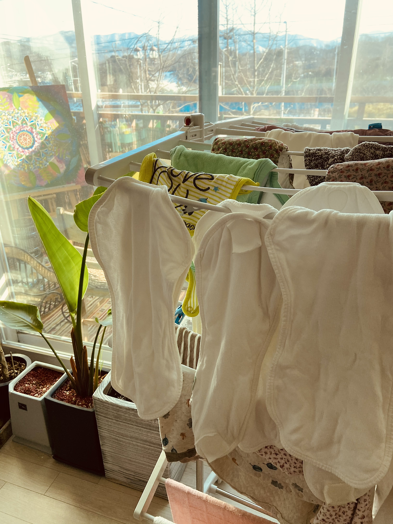 아이가 자고 나서도 여전히 할 일들은 남아있다. 하루 종일 나온 천기저귀를 세탁기에 돌리고 빨래 건조대에 널고 나서 거실과 부엌 뒷정리를 하고 나면 금방 자정이 된다. 이사하고 선물 받은 건조기가 있기는 하지만 가능한 전기를 덜 쓰기 위해 요즘은 건조기도 덜 쓰려고 노력 중이다.