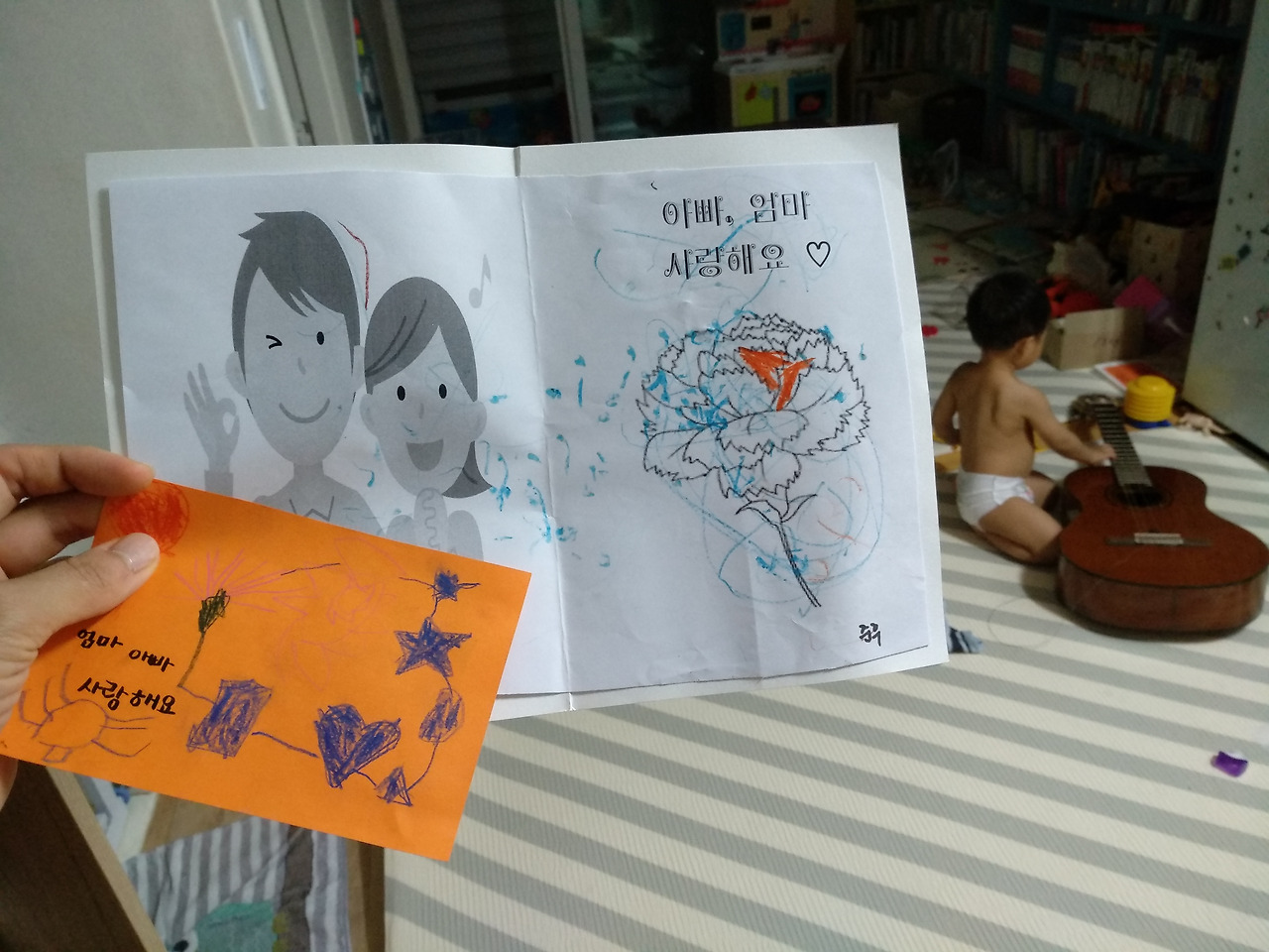 샤워를 하고 나오려니 거실에서 큰 아이와 아빠가 쿵짝 쿵짝 작전을 짜고 있다. 나더러 몸에 물기 닦으러 나오지도 말라한다. 그리고는 바람을 잡는다. 시간이 필요하다나. 조금 기다렸다 거실로 나갔더니, 바닥엔 두 장의 스케치북이 널부러져 있고, 아이는 용수철처럼 콩콩콩 뛰어다니며 울기 시작했다. 방으로 들어가버리는 아이들 아빠. 도대체 이건 무슨 상황이지. 보자하니, 아이가 아빠에게 대필을 부탁했고, 의뢰인은 아빠의 그림이 마음에 들지 않았다. 아마도 그려 준 하트의 크기나 모양이 제 성에 차지 않았나 보다. 그리하여 발생한 의뢰인과 대필 작가간의 다툼. 결국 내가 진화했다. 그렇게 아이에게 받은 편지. "엄마 사랑해요. -정후가" 큰 아이를 재우고, 거실로 나와 책을 펴 보았다. 아이에게 받은 편지와 책을 한 앵글에 넣어 사진을 찍었다. 궁금한 건 못 참는 둘째가 끼어든다. 미처 잠들지 않은 둘째의 발까지 함께 사진에 찍혔다. 며칠 전 아이들에게 받은 어버이날 편지까지 더해 코팅을 해 둘 요량이다. 근사해보이게.