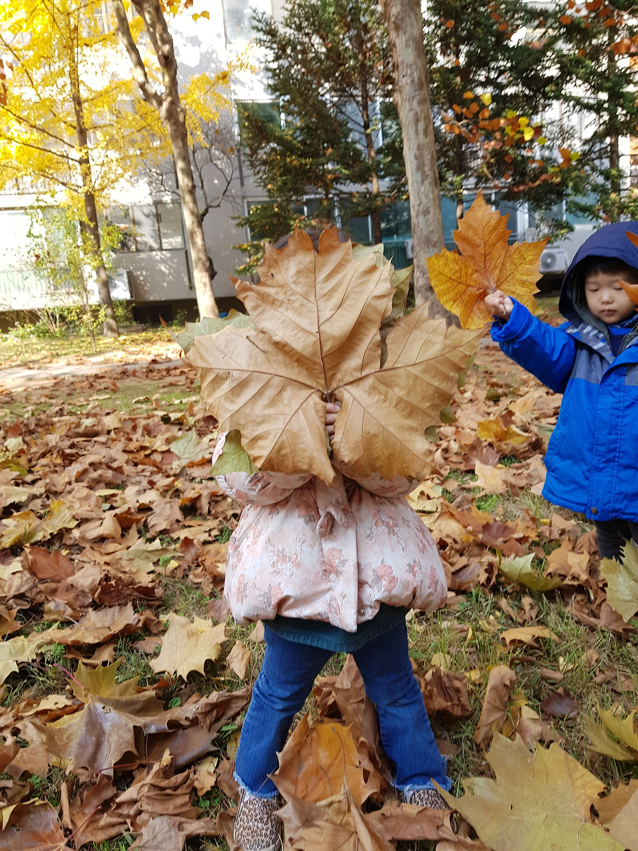 낙엽더미에 숨은 아이가 희희낙낙 빼꼼하며 브이를 그린다.