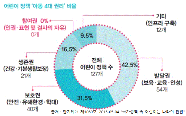 2015.05.04., 한겨레21, “국가정책 속 어린이는 나라의 찬밥” 어린이만을 위한 아동 예산은 3.6%에 불과, 그나마 발달권 중심으로만 짜여 있어, 어린이 정책을 어린이가 이야기할 ‘참여권’ 보장 필요해