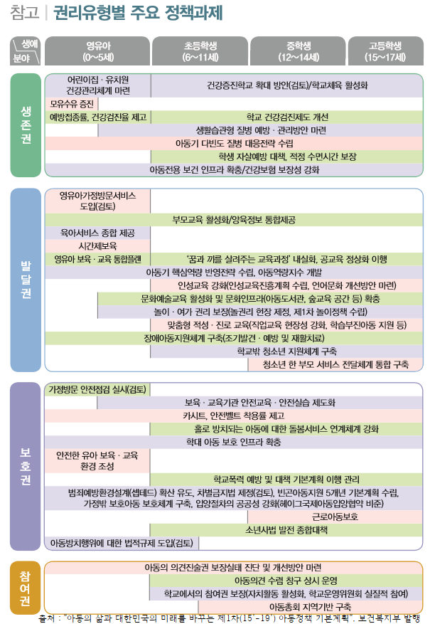 2015년 4월, 관계부처 합동(보건복지부 발행), 아동의 삶과 대한민국의 미래를 바꾸는 제1차(‘15-’19)아동정책 기본계획
