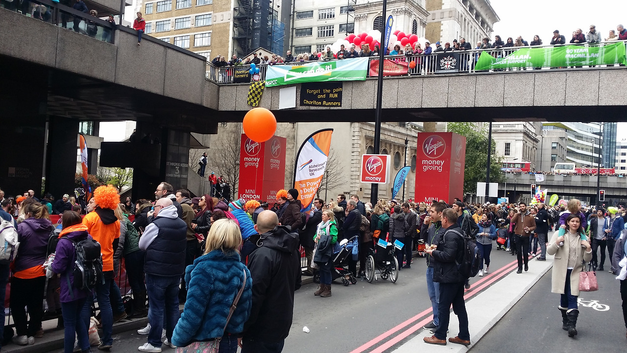 어린 시절, 일요일의 대중목욕탕 텔레비전에는 가끔 마라톤 중계를 보여줬던 것 같다. 그 외에는 마라톤 중계를 본 적이 없을 정도로 나는 러닝에 문외한이다. 그래서 참가자가 많은 것은 알고 있었지만, 관람객도 그렇게 많을지는 몰랐다. 아무래도 좁은 런던 시내가 주무대이다 보니, 참가하는 선수를 위해서 뿐만이 아니라, 많은 도로를 아예 통제하고 관람객들도 즐겁게 볼 수 있게 해놓았다. 코스 중간중간에는 밴드들이 음악을 연주하며 참가자들을 격려한다. 역시 야외에서 하는 행사 좋아하는 영국인들답게, 관람객들도 다들 술을 마시면서 같이 노래 부르고 소리치며 참가자들을 응원한다. 이쯤 되면 마라톤 대회라기보다는 '마라톤을 빙자한 축제'라고 불러야 할 듯하다. 참가자들의 재미있는 의상도 볼거리다. 기발한 아이디어에 피식하고 웃으면서도, 그냥 완주도 보통 일이 아닌데 저 무거운 의상들을 입고 뛴다니... 참 대단하다.