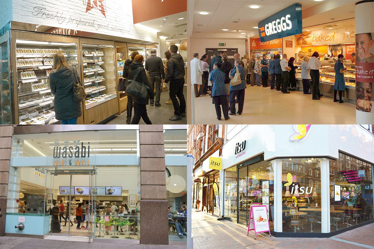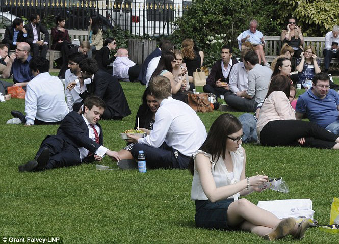 쉽게 찾을 수 있는 Pret A Manger, EAT, Geggs, ITSU, wasabi등과 TESCO나 Sainsbury's 등의 슈퍼마켓엔 점심을 사러 온 사람들이 길게 줄 서 있다. 선택의 종류 (파는 곳이나 파는 음식이나)도 사실 거의 없다; 정말 음식에 관해서는 관심도 없고 개발도 별로 안 하는 듯하다. 5,6 파운드로 대강 먹고 동료들과 이야기하면서 놀거나 낮잠을 좀 자다가 일터로 돌아간다.