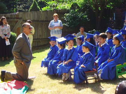 흔히 우리는 아이들과 '눈높이'를 맞추는 게 중요하다고 합니다. 그것의 전형을 보여주시는 분이죠, 둘째의 유치원 졸업식에서 교장선생님이 무릎을 꿇고 꼬마들에게 이야기를 들려줍니다. 키가 크신 분이라 무릎을 굽혀도 시선이 맞진 않습니다만 아이들 입장에서 대화를 나누려는 의지가 엿보입니다. 그런데 저는 여기서 또 다른 매력을 보았습니다. 실제건 영화에서건 상관없이 미국인들은 상사 앞에서나 친구의 아버지 앞에서나 건방지게 손을 바지 주머니에 찔러 넣고 삐딱한 자세로 대화를 하는 상황을 볼 수 있습니다. 유교의 영향력이 아직도 강력히 잔존하는 아시아 국가들에서는 절대 권장되지 못할 태도겠지요. 장인 앞에서 두 손을 호주머니에 넣은 채 미소를 짓고 있는 주인공을 보고 큰 충격에 빠졌던 기억이 떠오릅니다. 저건 귓방망이 감이라는 판단과 함께 말입니다. 경험이 많아 당신을 존중은 하지만 우리는 똑같은 인격체일 뿐이고, 제스처나 자세의 자연스러움은 예의와는 별개라 주장하듯 그저 태어나면서부터 몸에 밴 그들의 습성, 그 자체라고 할 수 있습니다. 교장선생님의 두 손은 지극히 당연스러워 보입니다만 이 역시 금쪽같은 아이들을 모시고 있는 우리나라의 선생님들에게선 좀체 보기 힘든 자세일 수 있습니다. 더구나 학부모들이 둘러싼 졸업식 아니겠습니까. 사진의 교장선생님은 어떤 마음으로 아이들을 대한다는 것일까요. 친히 잔디 위에 무릎을 꿇습니다. 집중력이 떨어지는 꼬마 녀석들이니 눈을 맞추기 위해서는 어쩔 수 없는 자세입니다. '나도 너희들의 소리를 이렇듯 가까이 들을 테니 너희들도 인간 대 인간으로서 내 말을 잘 듣고 이해했으면 한다. 나는 더없이 가까운 친구가 될 수 있지만 그렇다 하더라도 상전으로 모실 생각은 추호도 없다. 물론 떠들면 혼도 낼 거다' 하는 시크함의 극치가, 무릎은 꿇었지만 바지 주머니에 찔러 넣은 두 손을 통해 그대로 전해지는 것 같습니다.