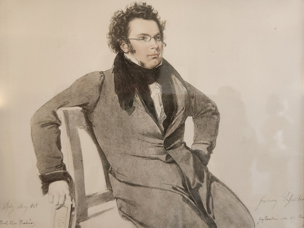 모리츠 폰 슈빈트: "그렇지 않을걸. 이봐 슈베르트, 이 녀석들 뭐라 해도 믿지 마. 나 정도 수준은 돼야 조언을 하는 거라고. 그나저나 거기 피아노 앞에 가만히 앉아있어 봐. 내가 취하기 전에 멋지게 스케치 하나 그려 줄 테니까."