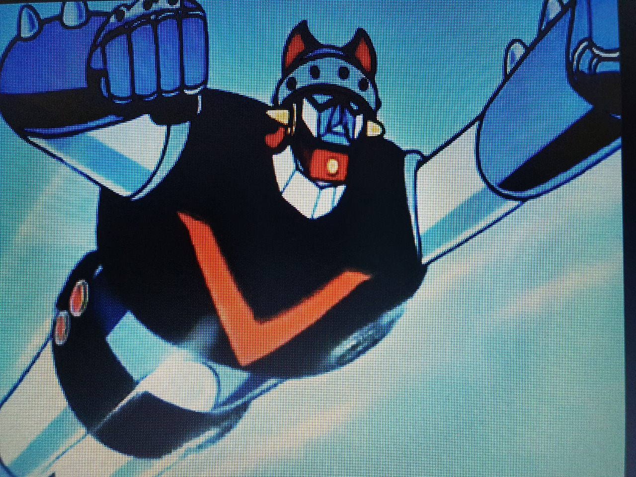 나의 영웅 태권 V가 두 팔을 곧게 앞으로 뻗어 적진을 향해 하늘을 날아가고 있습니다.