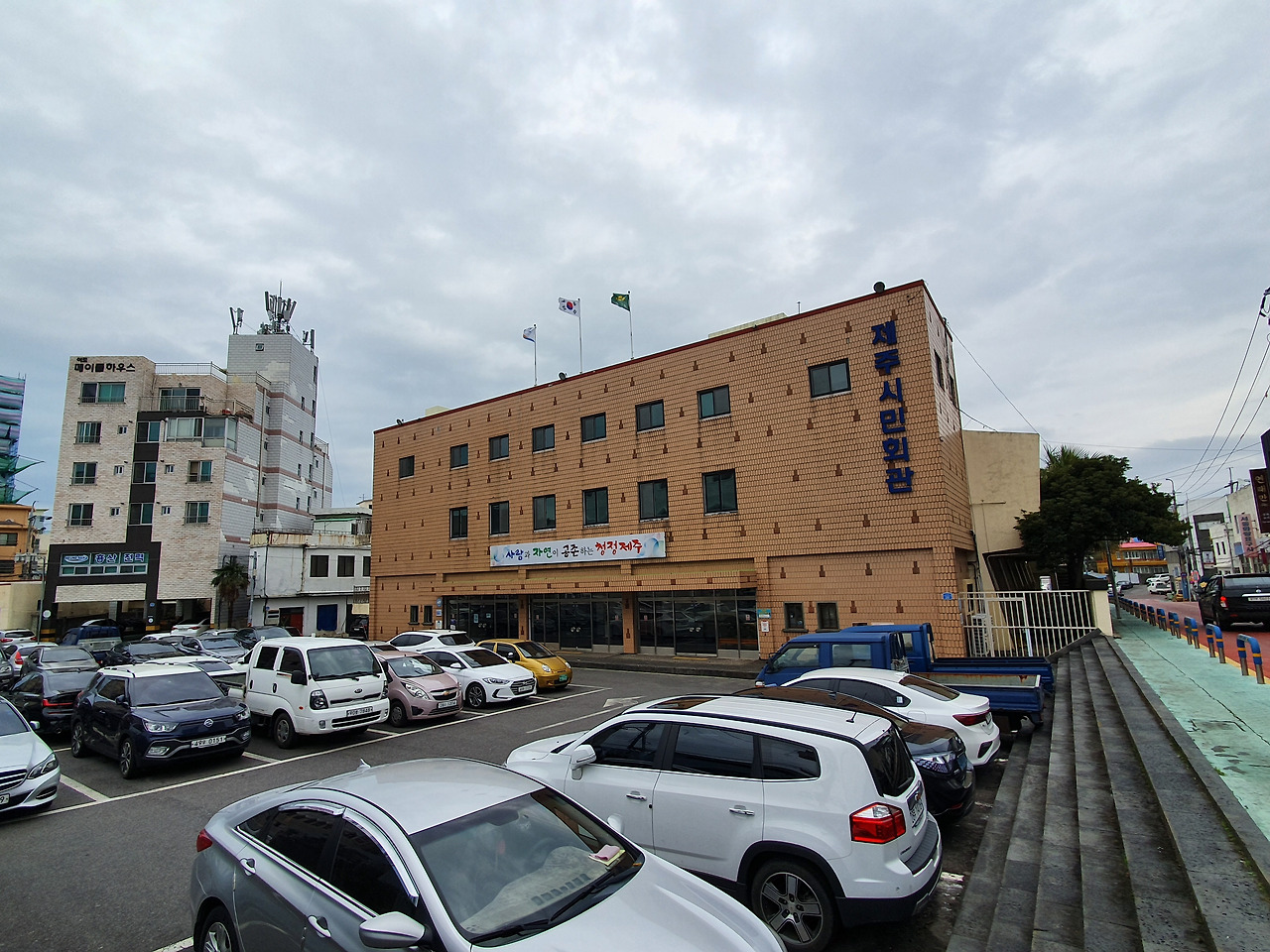 제주시민회관입니다. 겉보기엔 아직 멀쩡합니다. 아, 물론 내부 역시 보수작업을 거쳤기에 쓸 만합니다. 1964년에 건립되었으니 환갑을 향하고 있는 제주시 구도심의 터줏대감이지요. 그저 오래됐다는 이유만으로 기념비적 건물이 된 것은 아닙니다. 실내경기와 각종 이, 취임식을 비롯해 제주의 여러 굵직한 행사가 치러졌던 소중한 공간이라고 할 수 있는데요. 쓰임새뿐 아니라 철골 트러스 공법을 제주 최초로 적용해 지어진, 건축사적으로도 의미가 큰 건물이기도 합니다. 시민회관이 막 문을 열었을 당시 사진을 보면 주위가 온통 초가집 일색이었던 것을 확인할 수 있으니 한마디로 제주 현대 건축사의 살아있는 시조라 불러도 무리가 없을 듯합니다. 트러스 공법이란 재료를 삼각형 형태로 조립해 이를 접합한 뒤 서로 연결해 알맞은 구조체를 만드는 건축기법인데요, 시민회관이 충분한 실내공간의 확보로 체육대회를 치러야 할 '경기장'의 기능도 수행했다는 점을 감안하면 최적의 공법이라고 할 수 있겠습니다. 우리나라 전통건축에서 지붕이 'ㅅ' 자로 맞닿아 있는 맞배지붕의 연속된 모양으로 철골 뼈대를 연결해 나갑니다. 각 접합부위는 직각삼각형의 형태로 중력을 고루 나누어 받아 서로의 결속을 굳건히 하는 동시에 전체 지붕의 형태를 유지합니다. 철이라는 재료와 트러스 역학의 힘으로, 목조주택이라면 반드시 있어야 했을 기둥을 갖지 않아도 되니 내부 공간은 얼마나 광활하게 보였을까요. 해방 후 최초로 설립된 건축사무소의 작품이어서 그런지요, 역사적 가치가 한층 더 돋보이는 듯합니다. 건물의 정면에서 보면 직사각형의 건물인데 무슨 소리냐 하실 수 있습니다. 정면 바로 뒤에 이어진 본 시민회관의 지붕은 'ㅅ'자로 경사진 모양임을 높은 곳에서 내려다보면 알 수 있습니다. 한때 건축물 안전진단 C등급을 받아 철거의 위기에 놓였다가 보수공사를 통해 제주시민의 공간으로 다시 거듭났습니다만, 최근 정부의 생활밀착형 사회기반시설 사업으로 선정되면서 다시 9층 안팎의 새로운 건물로 신축되는 것으로 결정됐습니다. 그대로의 시민회관을 바라는 분들에겐 서운한 일이지만, 새로운 공간에서 추억을 만들어갈 세대들이 기다리고 있으니 너무 슬퍼하지 않으셨으면 좋겠습니다.