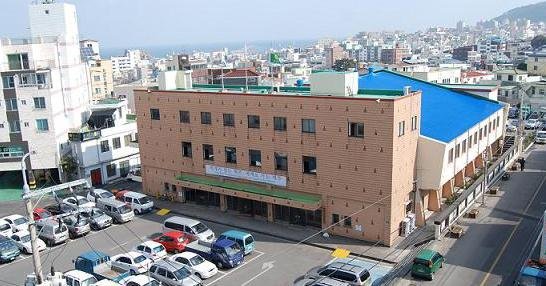 정면과 이어진 파란색 지붕의 뒷부분이 제주 최초의 철골 트러스 건축물입니다.