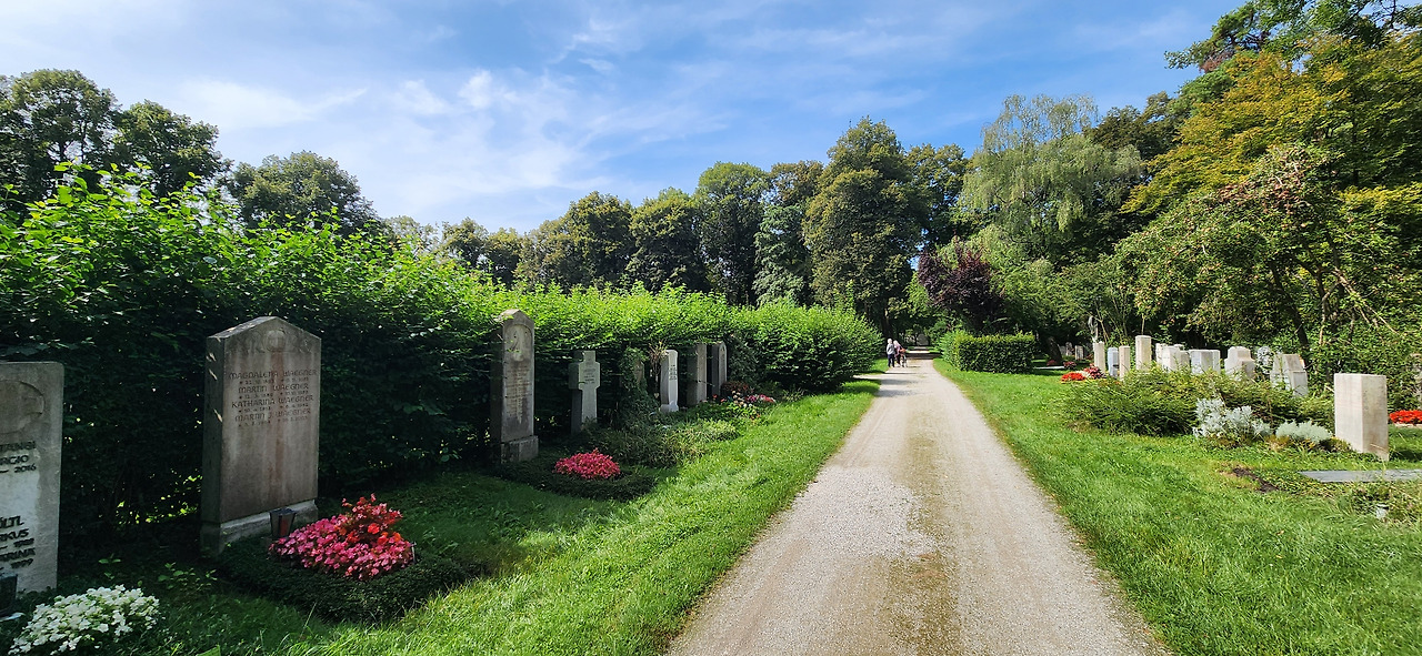 운전을 하고 오지 않을 경우엔 뮌헨 중심가에서 18번 버스를 타고 '백조의 호수 거리(Schwanseestraße)' 정류장에서 하차하면 된다. 근처 어디에 호수가 있다는 소리인 것 같은데 시야에는 들어오지 않는다. 정류장과 불과 십여 미터 거리에 묘지의 입구가 있다. 단조롭고 휑한 모양새다. 한쪽만 열린 철문에선 지각을 면하려 정면 돌파해야만 했던 학교 정문의 추억이 뭉게뭉게 피어난다. 남독일 최고의 문화도시 뮌헨이 자랑하는 대규모 공동묘지엔 어울리지 않는 첫인상이 아닌가. 입구에서 시작되는 자갈길의 진입로는 묘지 내부 깊숙이 그대로 이어져 구역을 양분한다. 나무들은 듬직하되 무겁지 않게 묘지를 호위하고 있다. 풍성한 잎들은 차양막이 되어 고맙게도 여름날의 직사광선을 가려준다. 'Forst(숲)'을 묘지명에 굳이 포함한 이유를 알겠다. 한산한 묘지에서 유족으로 보이는 이들은 묘비를 닦고 화초를 정리하고 있다. 페를라허 묘지는 앞으로도 가족묘를 얼마든지 수용할 수 있을 것만 같이 광활하다. 이 넓은 구역을 돌려면 처음부터 무리하면 안 될 일이다.