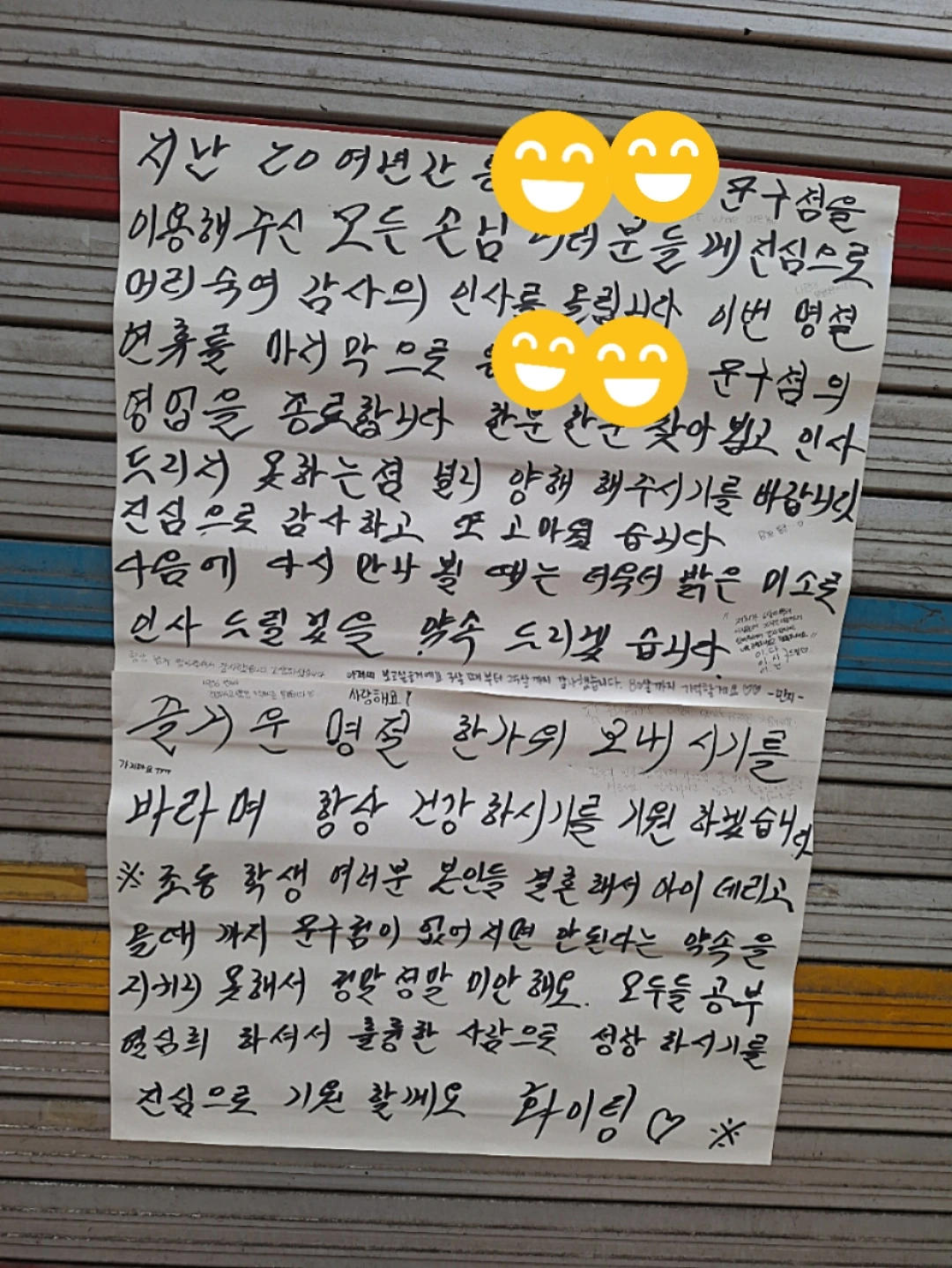 ‘개인 사정으로 부득이하게 문구점을 닫게 되었고 손님들에게 미안하다.’