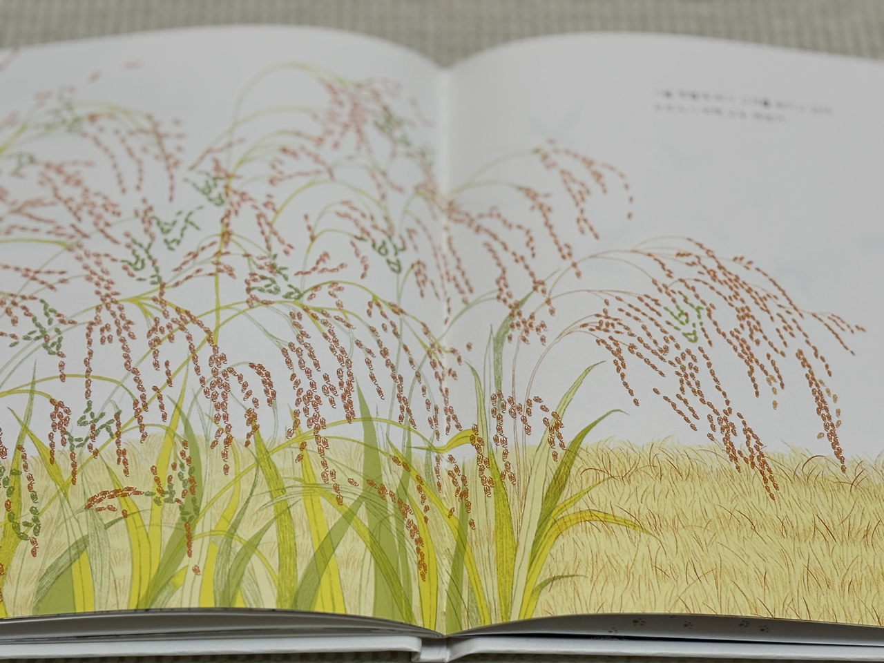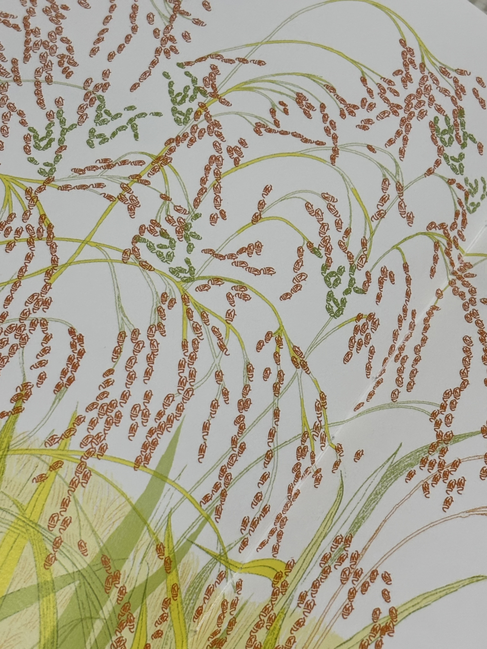 '쌀'과 '밥'으로 뒤덮인 고개 숙은 벼. 유난히 알알이 익은 열매가 무거워 보여, 수확이 임박해 보입니다. 농부들을 재촉하는 듯한 소리 없는 아우성이 독자에게도 들리는 듯해, 괜히 조바심도 납니다. 부지런히 자신의 목소리를 내는 벼를 보며, 조금이라도 늦게 수확했다간 화를 낼 것 같기도 해요.