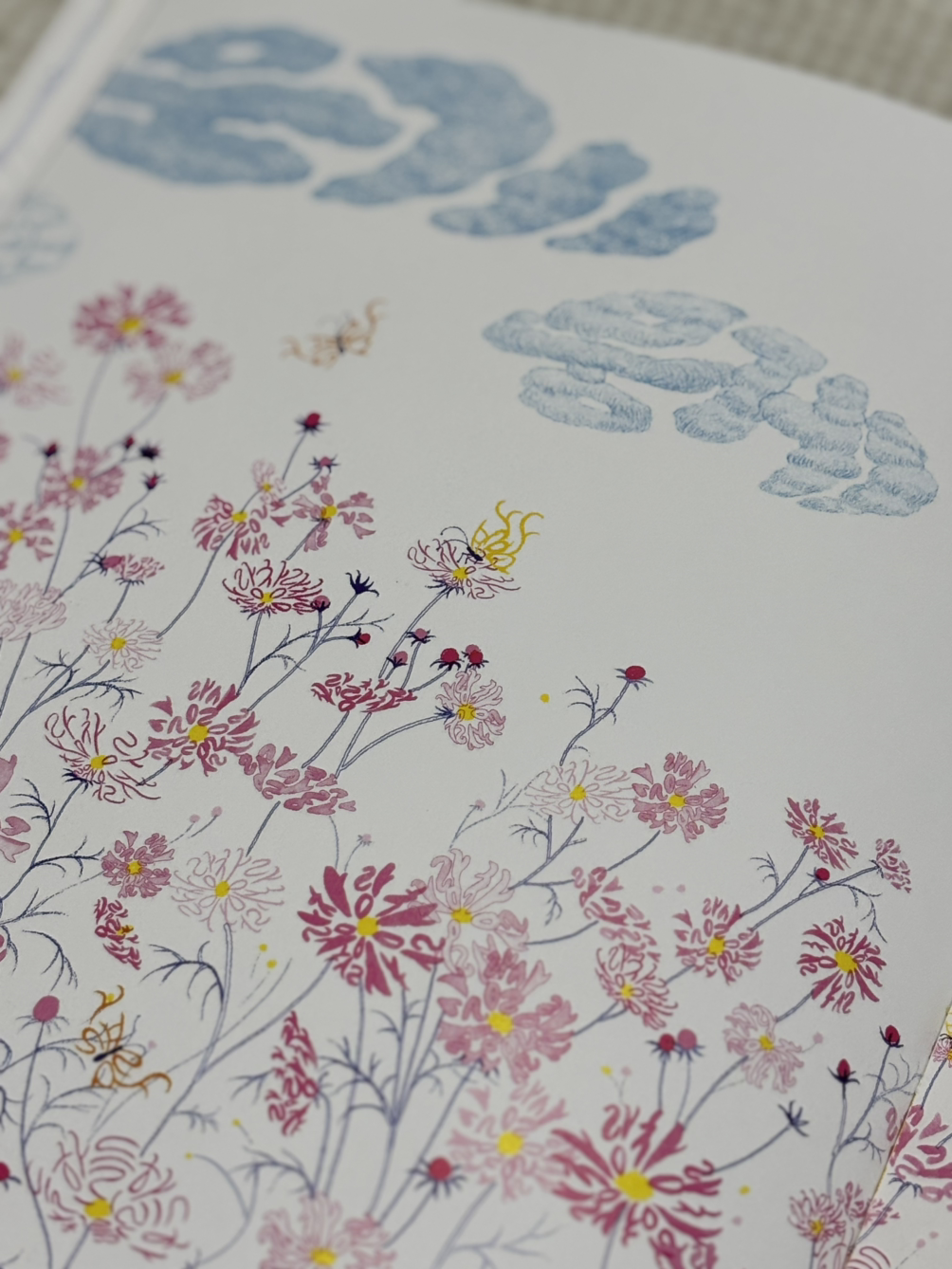 그리고 드디어 '가을'이 왔습니다. 이제는 조용하겠지, 싶었던 가을 역시 끊임없이 말을 해댑니다. 구름 하나 그냥 지나칠 줄 모르고 '뭉게뭉게'거리며 지나갑니다. 실제로 가을 속에 존재하면서, 그림책 속 가을에 존재해 보니 익숙하고도 신비롭습니다. 시끄럽고 재미있는 말소리 잔치를 보니, 가을의 소리를 더 찾아보고 싶어 집니다. 열심히 각자의 대열을 유지하며 부지런히 날아가는 철새 소리, 그냥 조용히 걷는 꼴을 못 보는 바스락 낙엽소리, 휑한 나무들 사이로 더 크게 들리는 것 같은 동네 강아지 소리, 심심할 틈을 주지 않을 만큼 종종 툭하고 떨어지는 밤송이 소리... 생각보다 가을은 흥겨운 계절이었어요.