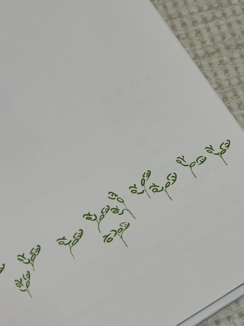 그렇게 표지를 뚫어져라 쳐다보다 어렵게 표지를 넘겼는데, 본격적인 그림책 이야기가 시작되기 전, 또 누군가 속삭이고 있습니다. '안녕, 안녕, 안녕, 안녕, 안녕.' 조용하게 수다스러운 새싹들이, 글씨인지 그림인지 헷갈리는 형태로 너울대고 있어요. 쪼끄만 새싹이 처음부터 너울대는 모습을 보니, 누구한테라도 괜히 툭 짓궂은 장난을 걸고 싶어 집니다. 만약 초조하고 긴장된 마음으로 이 책을 펼쳤다면, 단숨에 그 마음을 끊어버려 줄 만한 가벼움이 참으로 마음에 듭니다.