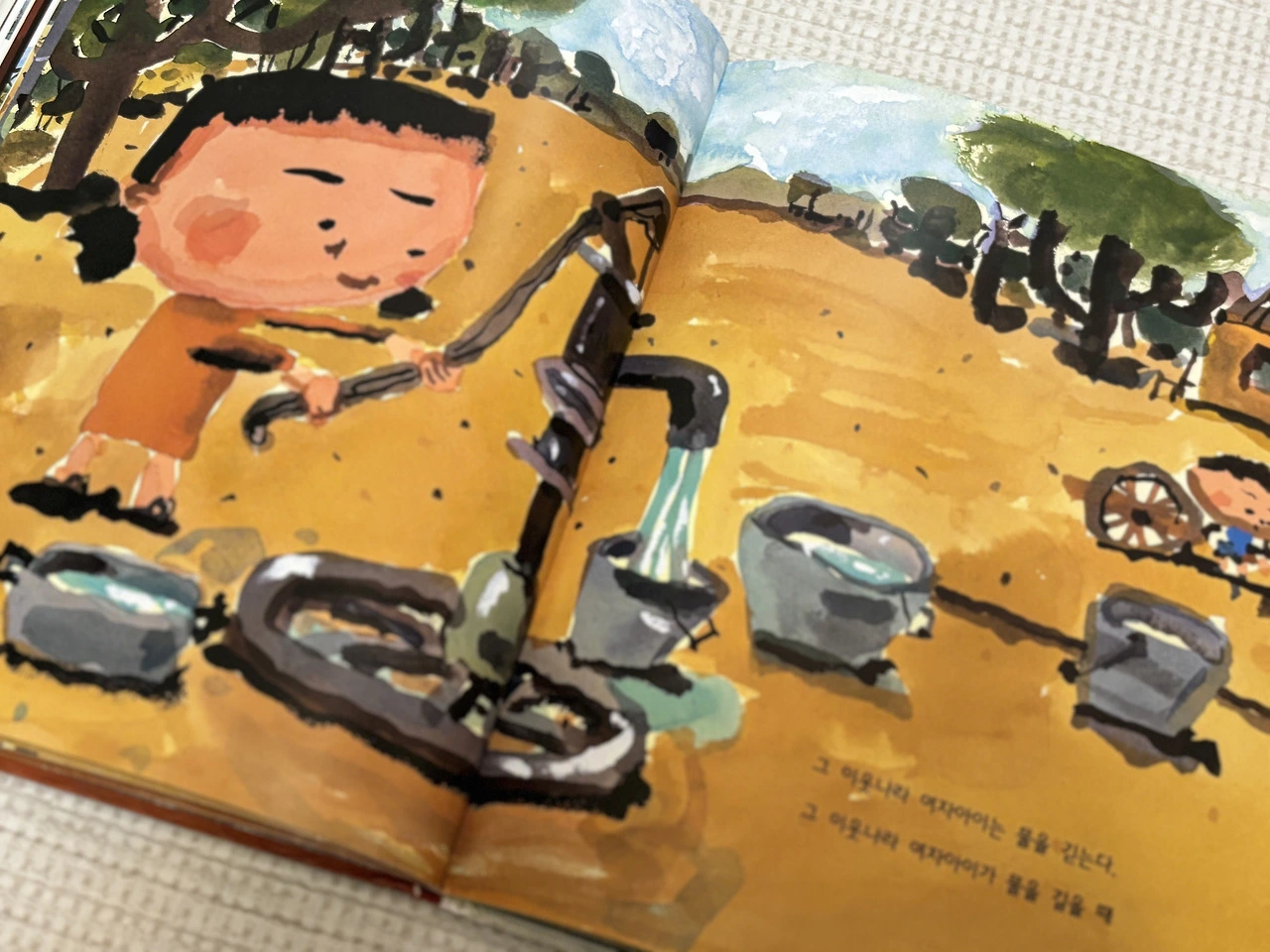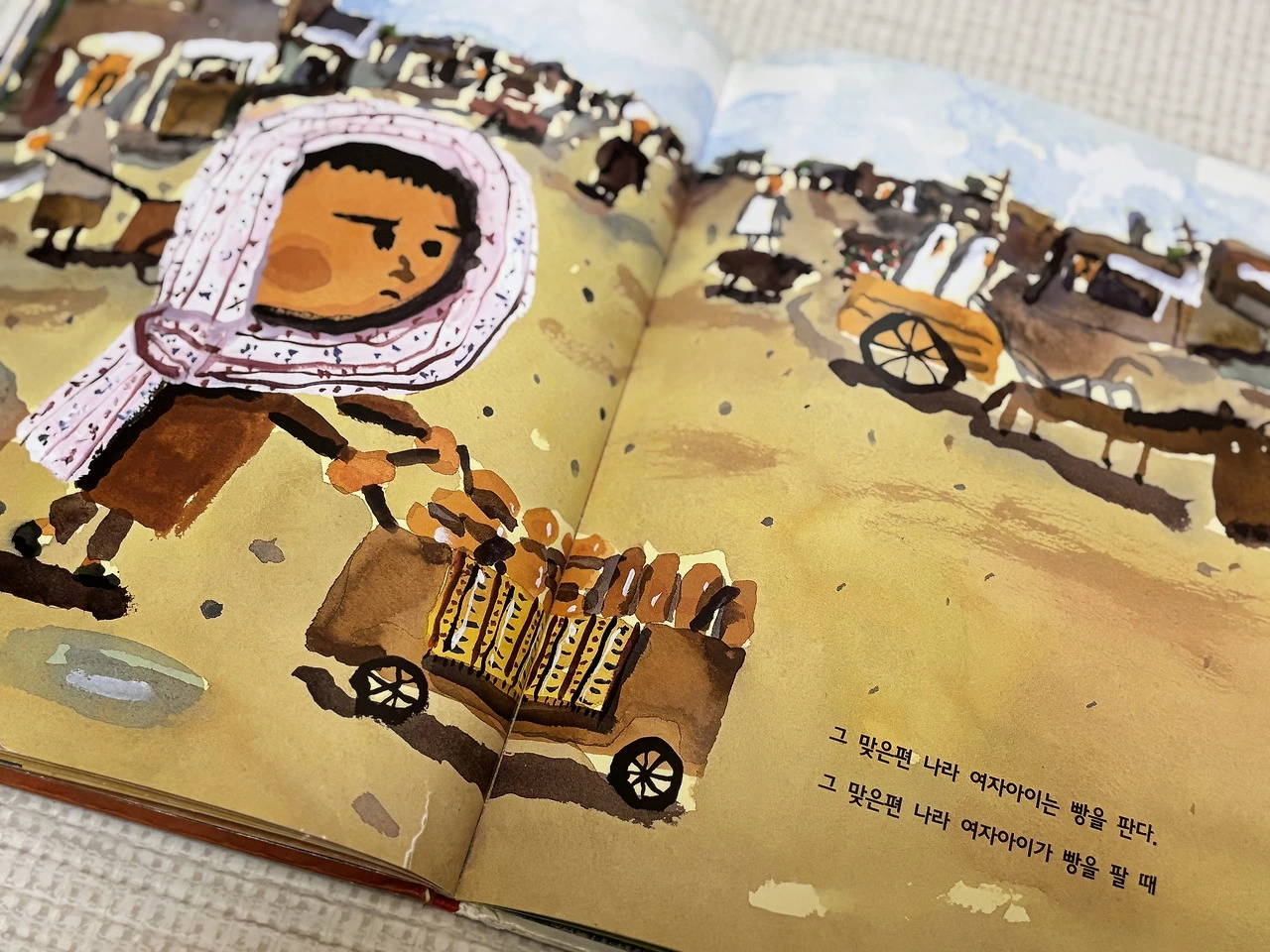 조금씩 그 돌이 무겁게 주저앉았습니다. 펌프질로 물을 긷고, 빵을 파는 여자아이. 아이의 표정이 제 마음처럼 굳어져갔습니다. 여리디 여린 아이들의 팔에 전해졌을 펌프와 빵수레의 무게가 저의 온몸이 전해지는 듯했습니다. 동시간대에 제 품 안에서 책을 읽는 저의 아이들이 누리는 삶에서는 상상하기 어려운 일상들이 알삽하게 그려졌습니다.