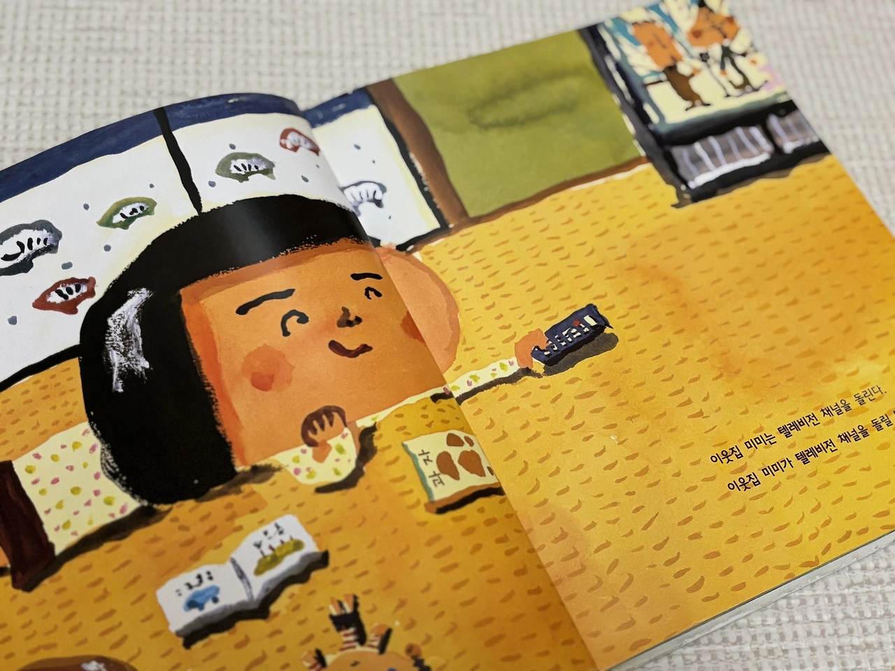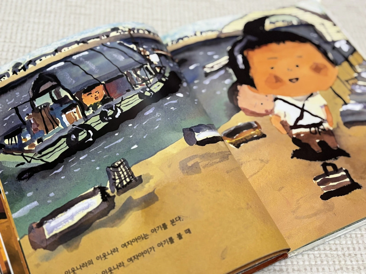 그러다 마주한 이 페이지에서, 잠시 마음에 돌이 쿵 내려앉는 듯했습니다. 이 마음의 돌이 과장된 해석이었길 바라며, 동생으로 추정되는 아기를 돌보는 한 여자아이의 작은 어깨를 한참 들여다보려다, 얼른 페이지를 넘겼습니다.
