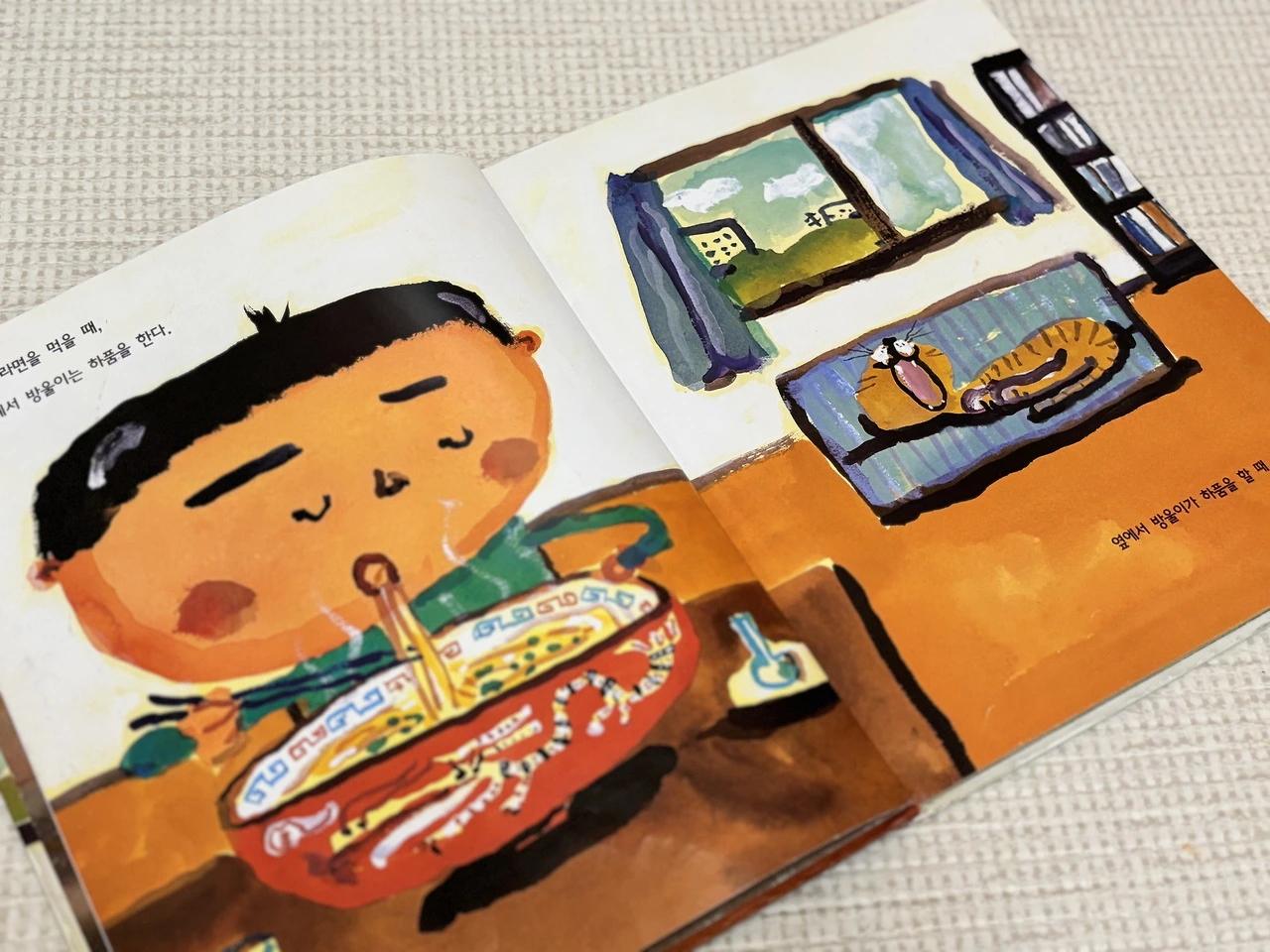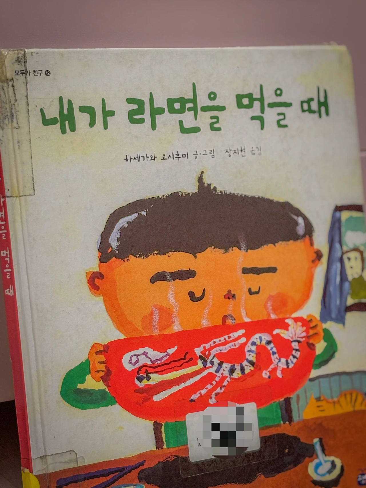 하세가와 요시후미의 '내가 라면을 먹을 때'라는 그림책입니다. 다시금 이 책의 표지를 볼 때마다 그저 고개가 숙여집니다. 일본 작가가 그려낸 일본 아이의 라면 먹는 이야기는 어떤 서사를 가지게 될까, 그게 전부였어요. 아직 어려서 라면을 먹어본 적 없는 제 아이에게, '라면 먹는 오빠'의 재미난 이야기를 읽어보자며 호기롭게 펼쳤던 기억이 납니다.