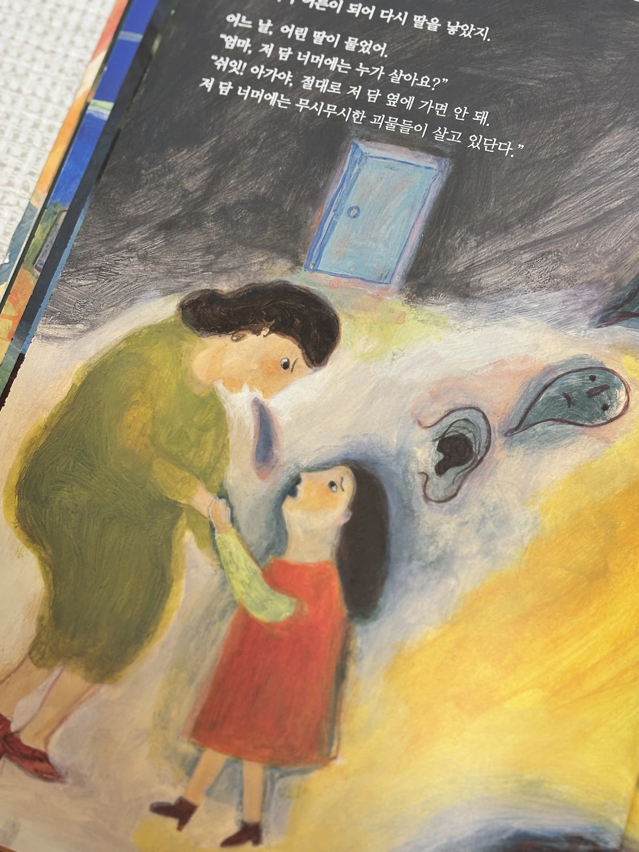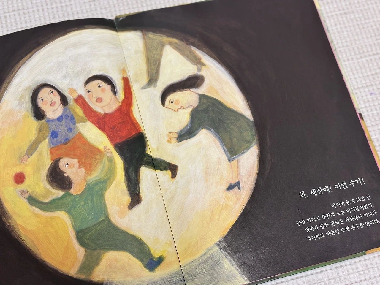 그 너머에는, 자신과 너무도 닮은 또래 아이들이 웃으며 뛰어놀고 있었습니다. 무시무시한 괴물이 산다던 어른들의 말과는 전혀 다르게, 경계의 반대편에는 그저 다른 사람이 아닌, '또 다른 나'가 있었던 거예요. 성큼 담 너머로 넘어간 아이는 말합니다.
