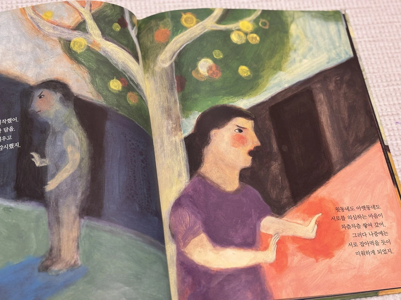 울타리 안쪽에 반쯤 갇혀 있지만, 벽 너머로 시원하게 가지를 뻗어낸 감나무를 만났습니다. 어른들이 지켜주고자 세워놓은 벽을 뒤로하고, 자신 있게 뻗어나간 가지는 꼭 아이들 같습니다. 가만히 벽을 넘나드는, 스스로 자라나는 생명력이 참 좋아 보였습니다. 이 생명력을 한 번 더 소중하게 여겨볼 수 있었던 그림책을 소개해보려고 합니다.
