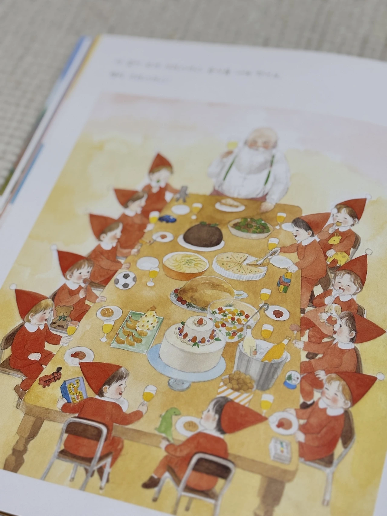 드디어 크리스마스 당일이 되었습니다. 다른 아이들을 위해 수많은 일을 봉사했을 아이들에게도 하나씩 선물이 들려 있습니다. 그리고 거대한 만찬을 위해 옹기종기 둘러앉았습니다. 사실 오랜 기다림과 설렘의 크기에 비하면 조금 허무하기도 합니다. 선물 받고, 맛있는 것 먹고, 끝. 그 이상 그 이하도 없이 고점을 향해 오르던 12월이 갑지가 뚝 하락합니다. 하지만 그 공허함과 남겨진 마음 때문에 설렘의 가치는 빛나는 듯합니다. 작은 선물을 받고, 함께 조금은 특별한 음식을 많이 먹는 날. 일상에서 '조금'의 향기를 가미한 하루가 우리에게 얼마나 큰 기쁨과 살아갈 힘을 주는지, 그 힘은 엄청납니다.