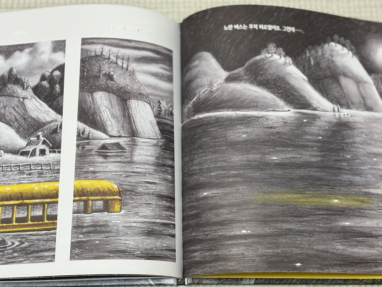 물속에 잠겨 마을 사람들에게는 보이지 않지만, 여전히 독자들에게는 노란빛으로 그 존재는 계속되고 있음을 열심히 알려주고 있었습니다. 앞으로 또 얼마나 물이 불어나고 마을이 변할지는 모르겠지만, 어떤 상황에서도 열심히 존재해 준 노란 버스가 참 고마웠습니다. 뭔가, '희망' 같았다고 할까요. '이대로도 괜찮아.' 그의 충분한 메시지가 메아리치듯, 울려 퍼졌습니다.