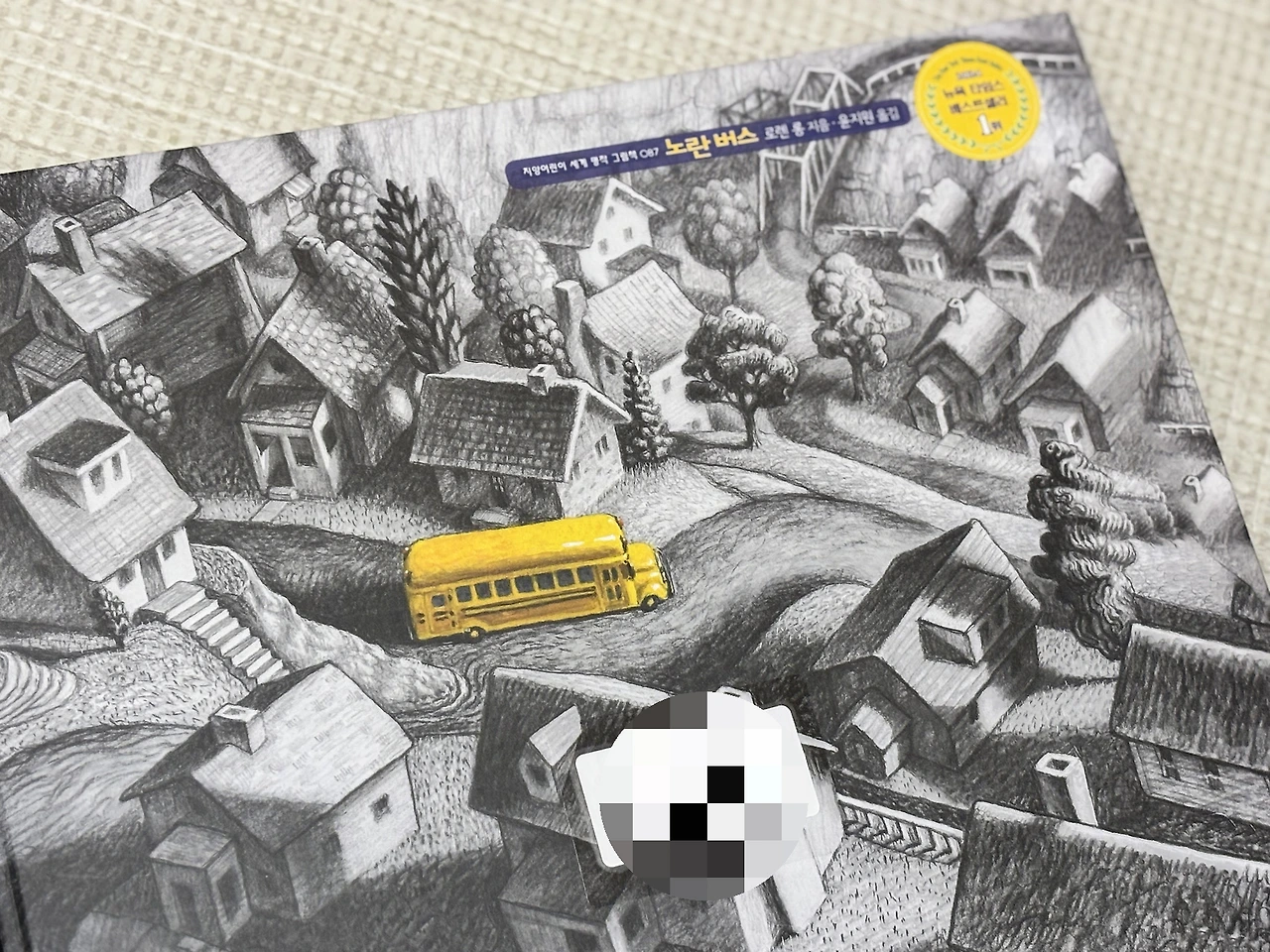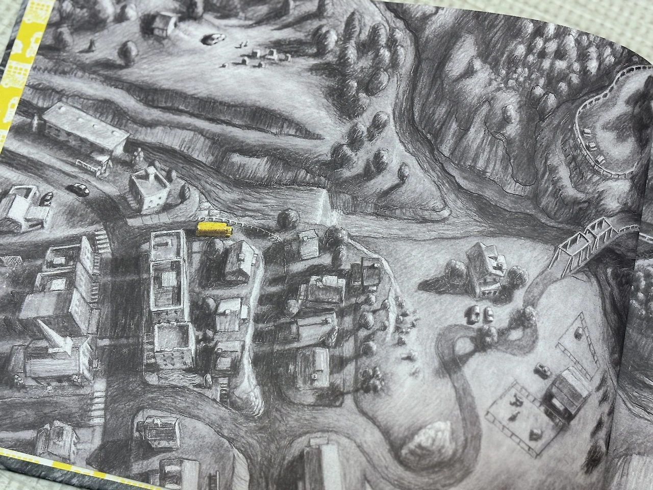 구불구불, 굽어진 길들 과 각자의 모양새로 지어진 집들 사이로 노란 버스가 지나갑니다. 그림 속에 그려진 것은 많지만, 흑백 속에서 '노란색'은 유난히 환하게 느껴집니다. 이 마을을 주름잡는 느낌도 들고, 유일하게 존재하며 살아 숨 쉬는 것 같아요. 멀리서 조망해 보느라 크기가 작아진 버스에게서 설명할 수 없는 신비한 힘이 느껴지는 것 같기도 합니다.