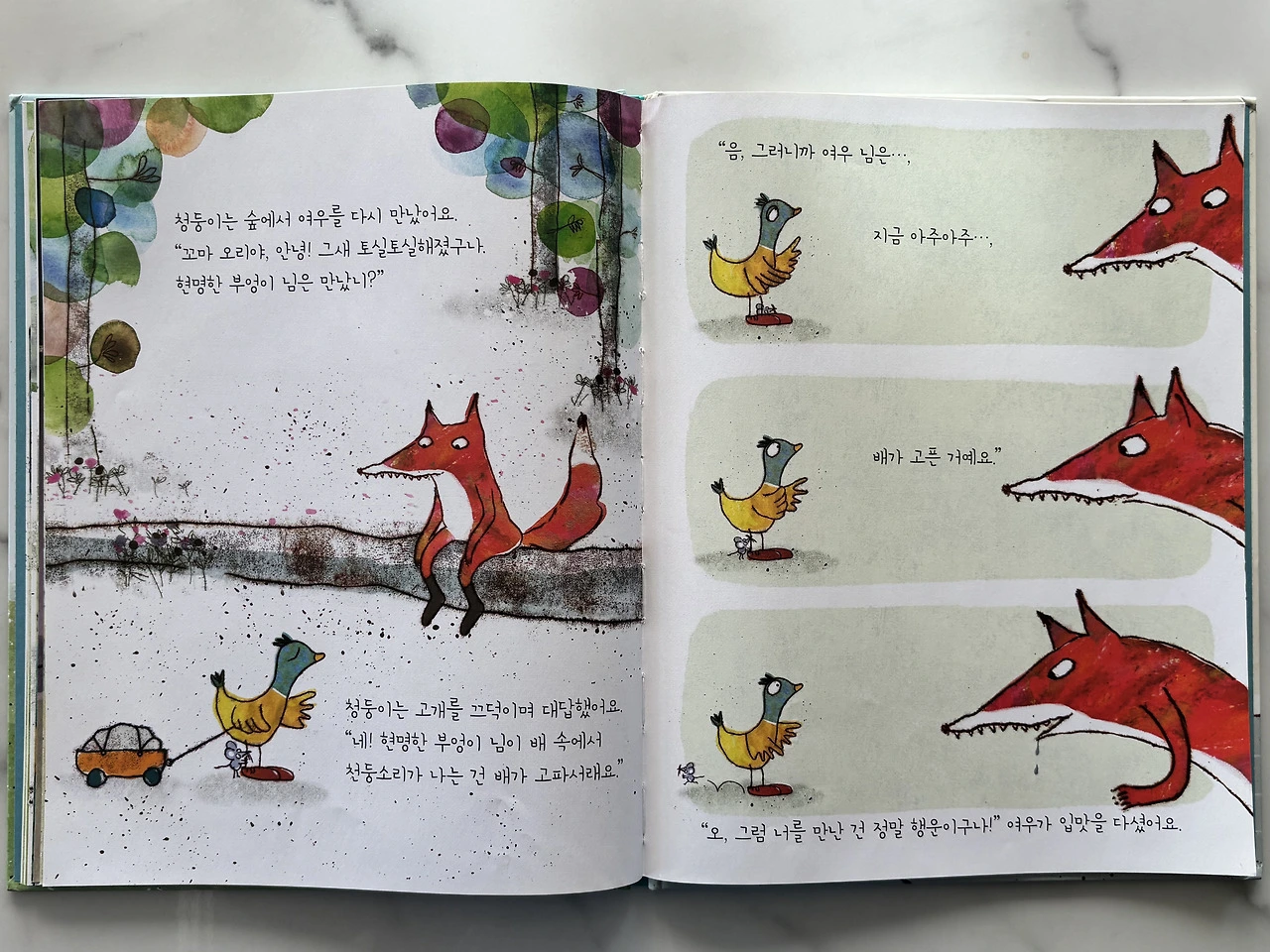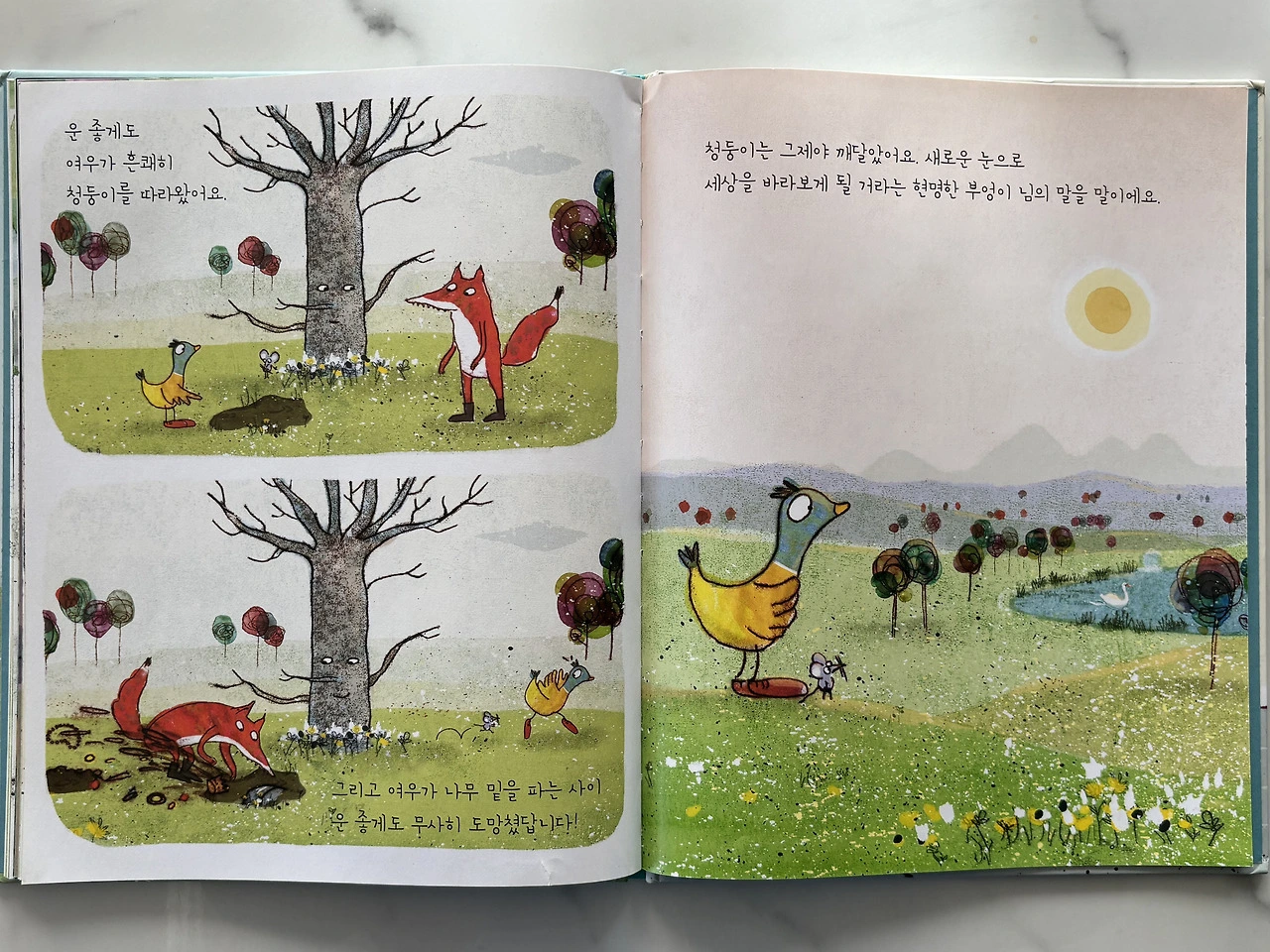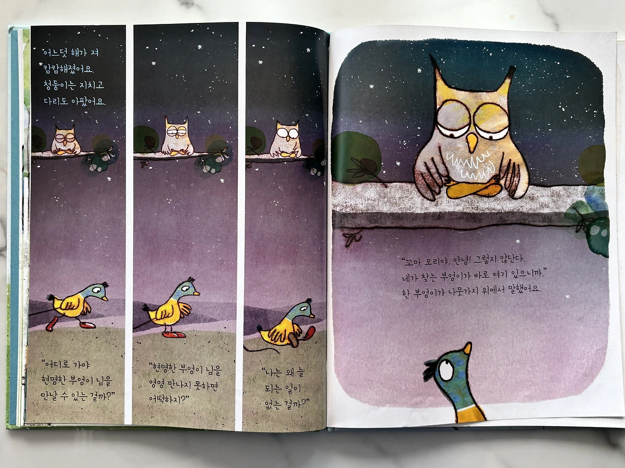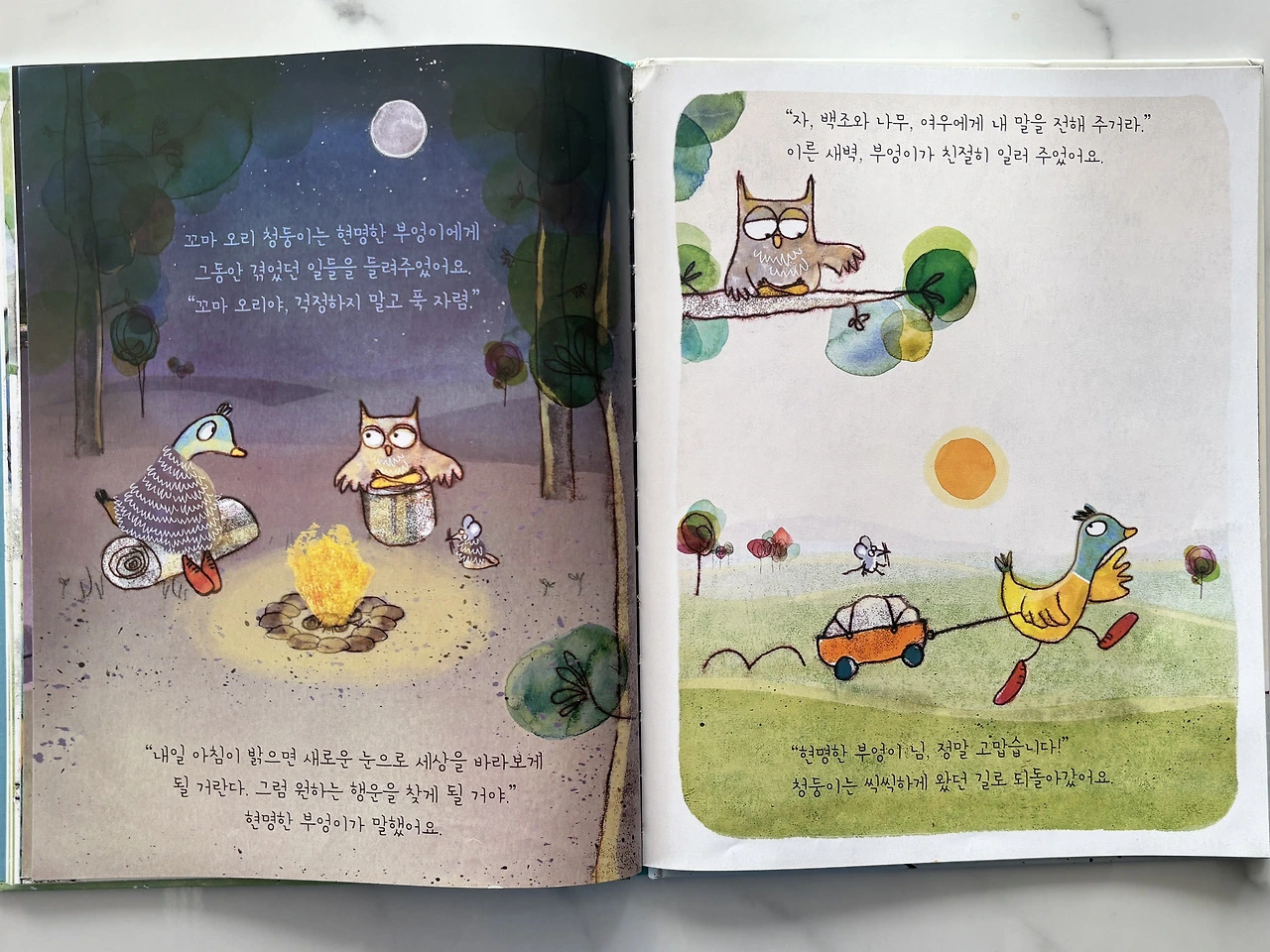 아침이 되어 새로운 날을 맞이하고, 새로운 눈으로 세상을 바라보게 된 청둥이. 행운에 대한 경로와 해답을 얻기 위해 만났던 부엉이가 대단한 묘책을 제시해 준 건 아니었습니다. 그저 오늘을 살아낼 수 있었던 것을 '운 좋게' 받아들이기까지 우여곡절은 있었지만 그래도 깨달았습니다.