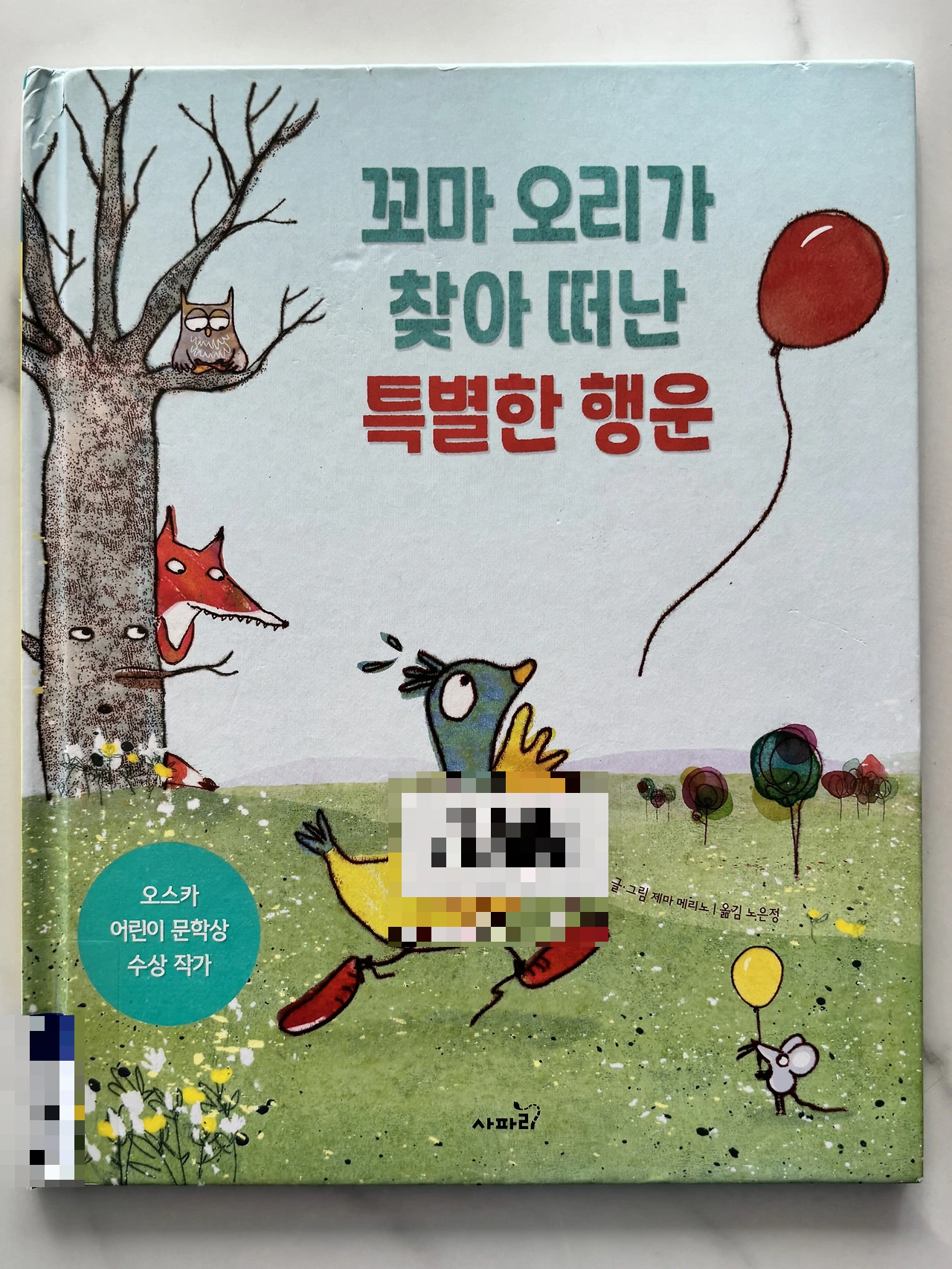 제마 메리노의 '꼬마 오리가 찾아 떠난 특별한 행운'이라는 그림책입니다. 손에서 갓 놓친 듯한 풍선이 하늘로 올라가고, 꼬마 오리는 당황스러운 표정으로 풍선을 쫓습니다. 그 모습을 바라보는 부엉이와 여우와 나무가 보입니다. 그리고 작은 생쥐가 꼿꼿이, 꿋꿋하게 자신의 몸에 걸맞은 풍선을 꼭 움켜쥐고 있습니다. 이 이야기를 읽고 나서 다시 표지를 찬찬히 살펴보면 더욱 흥미로운 그림입니다.