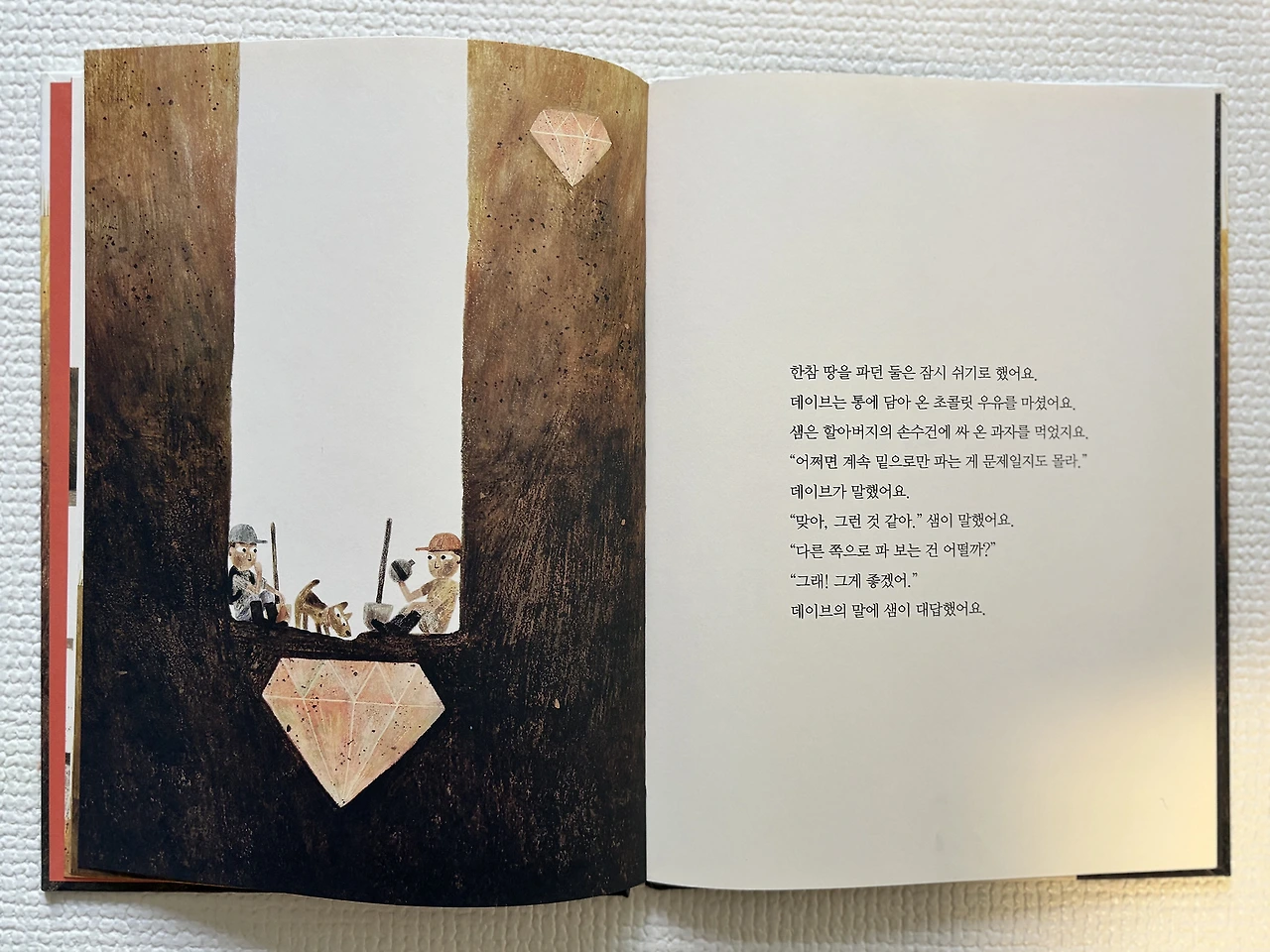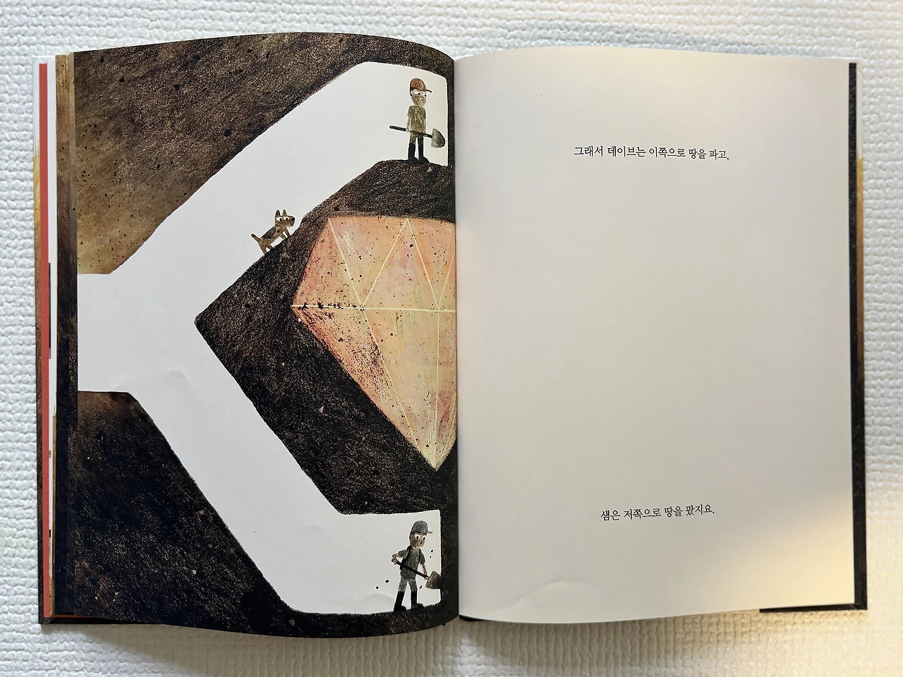 꽤나 깊이 판 듯합니다. 샘과 데이브는 조금만 더 파면 찾을 수 있는 다이아몬드를 바로 엉덩이 아래에 두고, 지쳐버렸습니다. 정작 샘과 데이브에겐 보이지 않고, 독자들의 눈에만 보입니다. 아이들은 다급하고 안타까운 마음으로 "여기 있는데!!!" 라며 다이아몬드를 가리킵니다. 답답하고 안타까움을 한가득 실은 목소리가 샘과 데이브에게 들리길 바라는 마음이 느껴졌습니다. 어린아이들이 보기에도 '어마어마하게 멋진 것'은 '다이아몬드, 보석'이라고 당연히 생각했는지, 아니면 우산이나 물통, 로션과 같은 것이 그려져 있었더라도 "여기 있는데!"라고 외쳤을지 문득 궁금해졌습니다.