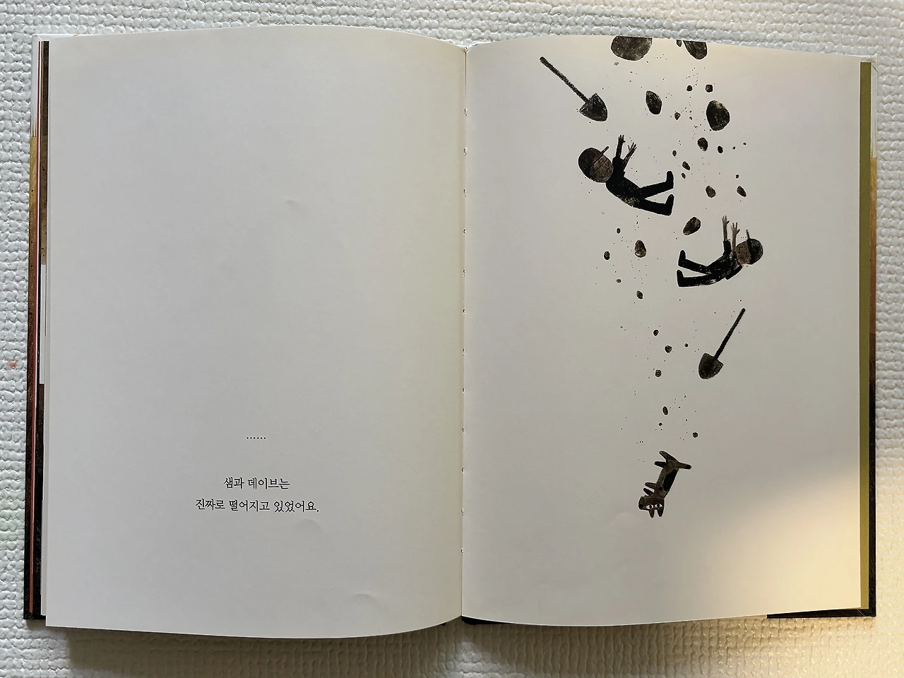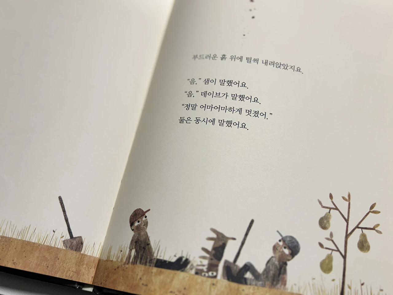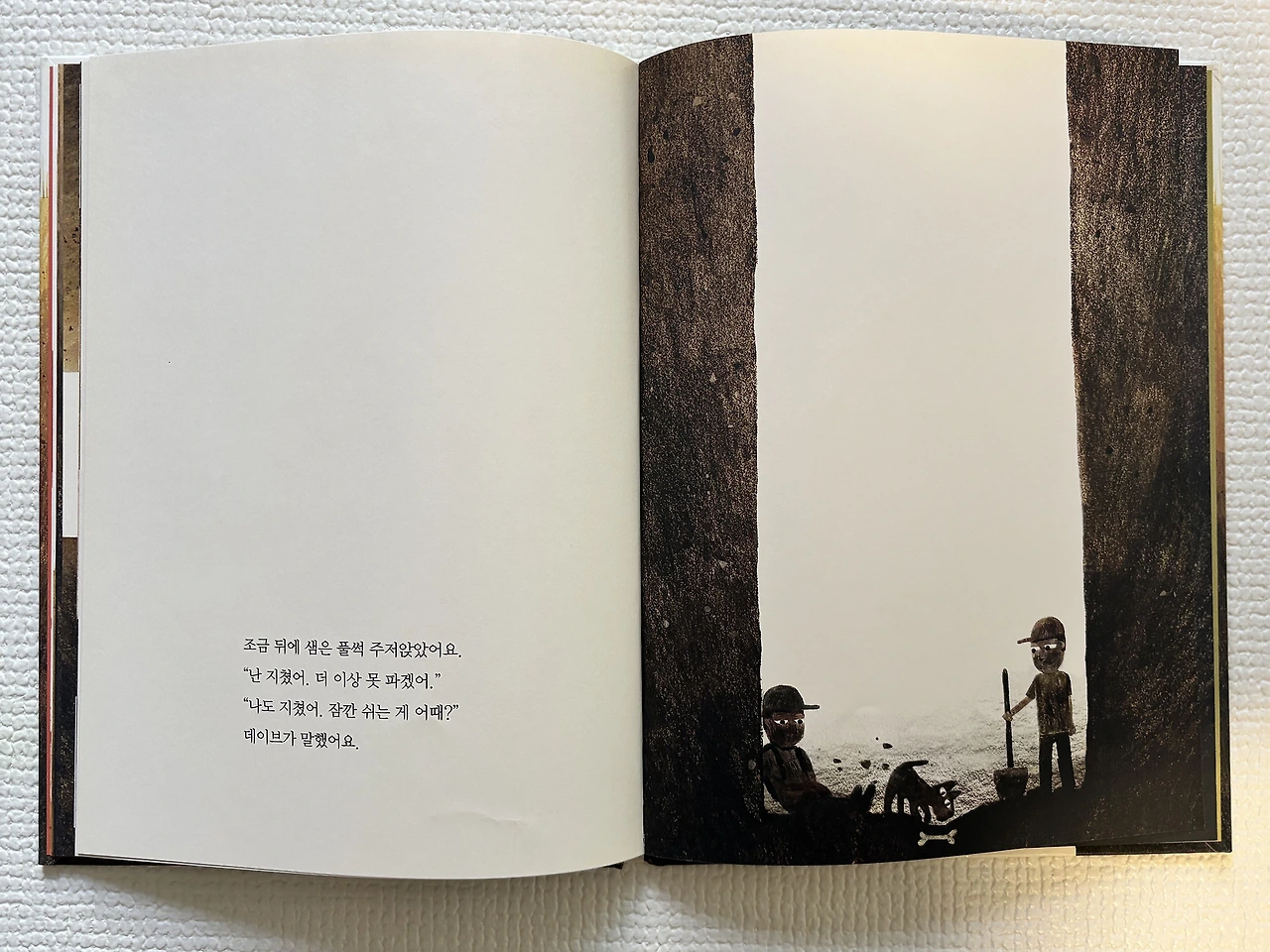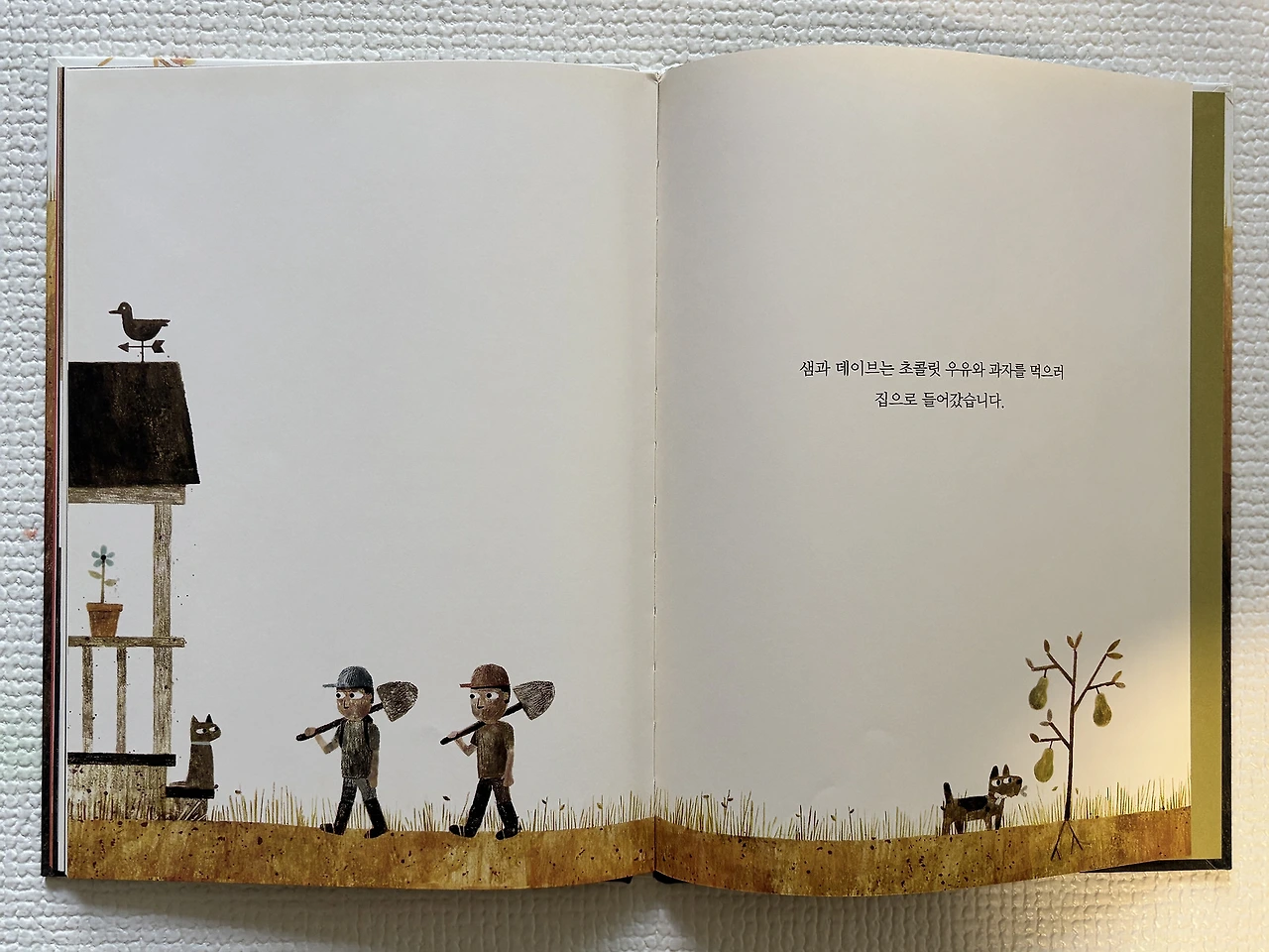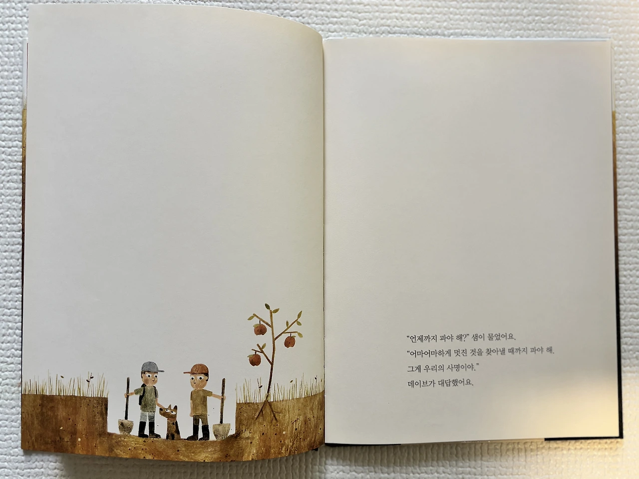 어마어마하게 멋진 것을 찾는 '사명'을 위해 샘과 데이브는 땅을 파기 시작합니다. 삽화 외에 여백이 더 크게 보입니다. 넓은 하늘을 표현하기 위해서였을까, 두 주인공의 속마음을 독자들이 말풍선을 그려가며 마음껏 상상해 보라는 배려였을까. 아이들에게 이 책을 읽어줄 땐 '어마어마하게 멋진 것'이 무엇인지 저도 알고 싶은 조급함에 책장을 서둘러 넘겼지만, 저 혼자서 다시 읽게 되었을 때는 가만히 여백을 응시해 보았습니다.