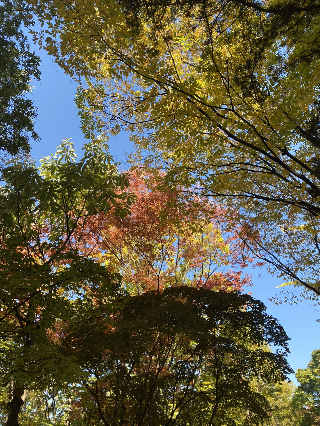 그래서 바람이 살짝만 스쳐도 잎들이 무지개 빛 나는 비처럼 낙엽들이 아름답게 떨어진다. 하지만 그 짧은 순간마저도 갑자기 내린 가을비에 한순간 다 떨어져버려 아쉽게도 나무들이 금방 앙상한 가지들을 내보였다.