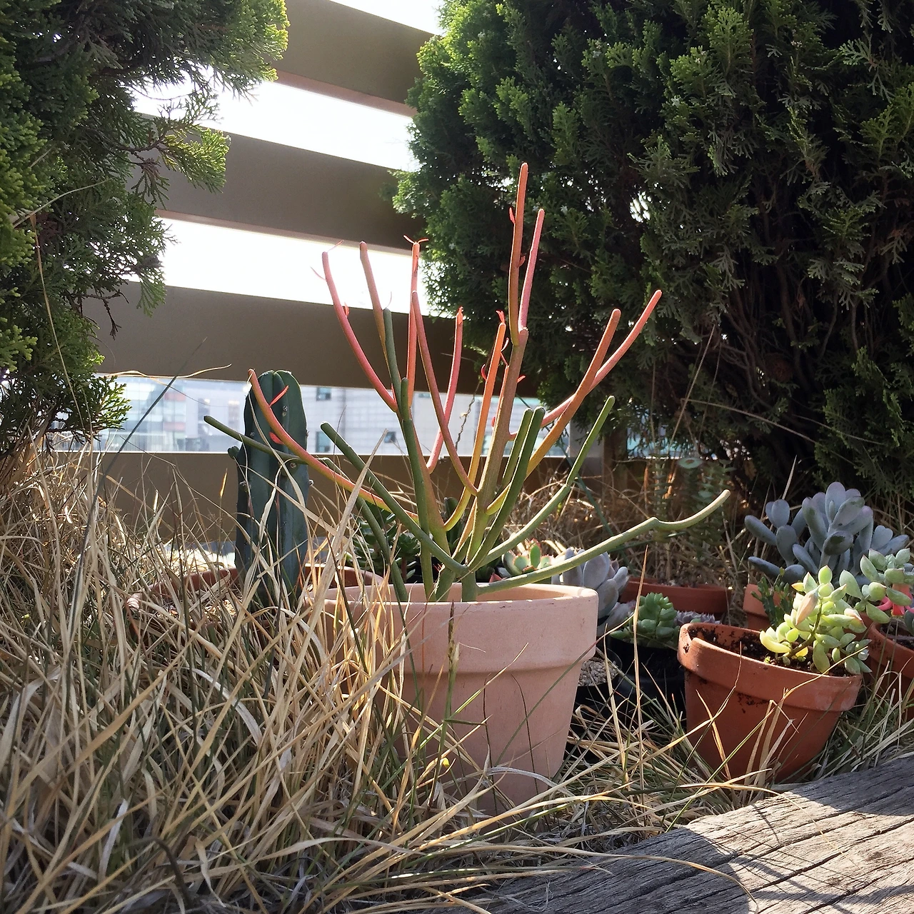 나는 그중에서도, 파티오라금(Euphorbia tirucalli, 티루칼리, 유포르비아 티루칼리)의 단풍을 가장 좋아한다. 미국에서 서부 길거리에서 흔하게 볼 수 있는 다육과의 식물이며, 미국에서는 fire stick이라고 불리는데, 실제로 정말 불이 붙은 것만 같은 빨간색으로 물들기 때문이다.